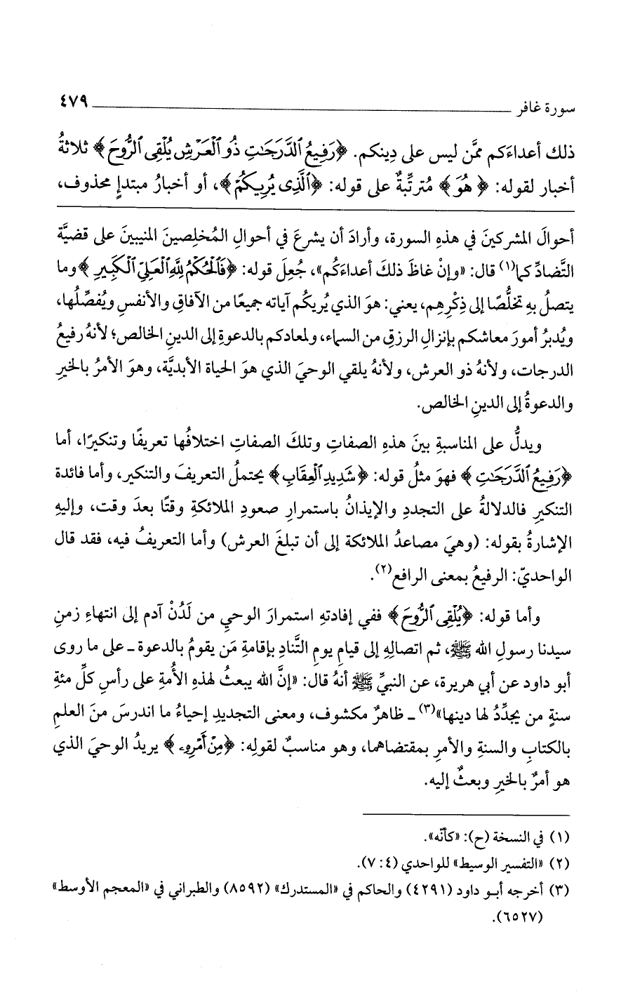وأما قوله: {يُلْقِي الرُّوحَ} ففي إفادته استمرار الوحي من لدن آدم إلى انتهاء زمن سيدنا رسول الله صلى الله عليه وسلم، ثم اتصاله إلى قيام يوم التناد بإقامة من يقوم بالدعوة_ على ما روى أبو داود عن أبي هريرة، عن النبي صلى الله عليه وسلم أنه قال: "إن الله يبعث لهذا الأمة على رأس كل مئة سنة من يجدد لها دينها"_ ظاهر مكشوف، ومعنى التجديد إحياء ما اندرس من العلم بالكتاب والسنة والأمر بمقتضاهما، وهو مناسب لقوله: {مِنْ أَمْرِهِ} يريد الوحي الذي هو أمر بالخير وبعث إليه.