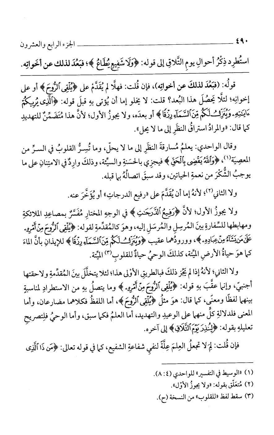 رَفِيعُ الدَّرَجَاتِ ذُو العَرْشِ يُلْقِي الرُّوحَ مِنْ أَمْرِهِ عَلَى مَن يَشَاءُ مِنْ عِبَادِهِ لِيُنذِرَ يَوْمَ التَّلاقِ * يَوْمَ هُم بَارِزُونَ لا يَخْفَى عَلَى اللَّهِ مِنْهُمْ شَيْءٌ لِّمَنِ المُلْكُ اليَوْمَ لِلَّهِ الوَاحِدِ القَهَّارِ