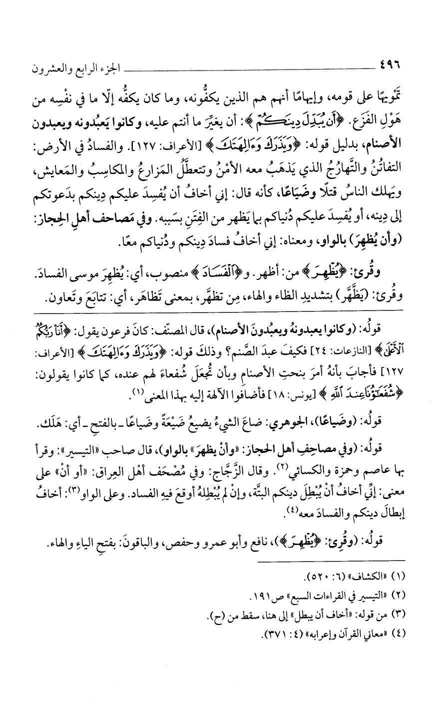 وقرئ: {يُظْهِرَ} من: أظهر. و {الْفَسَادَ} منصوب، أي: يظهر موسى الفساد. وقرئ: 0 يظهر) بتشديد الظاء والهاء، من تظهر، بمعنى تظاهر، أي: تتابع وتعاون.