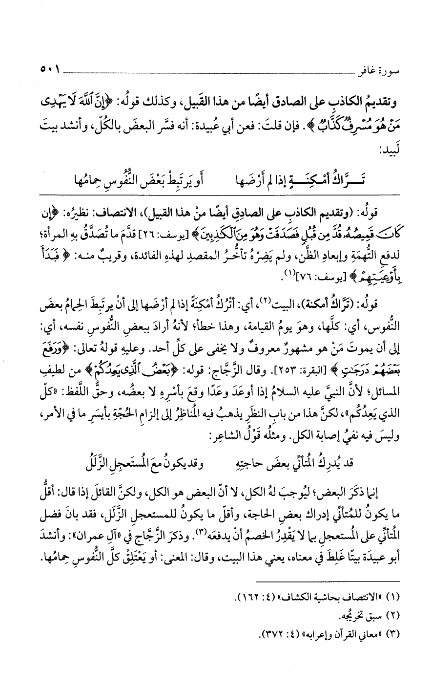 قوله: (تراك أمكنة)، البيت، أي: أترك أمكنة إذا لم أرضها إلى أن يرتبط الحمام بعض النفوس، أي: كلا، وهو يوم القيامة، وهذا خطأ؛ لأنه أراد ببعض النفوس نفسه، أي: إلى أن يموت من هو مشهور معروف ولا يخفى على كل أحد. وعليه قوله تعالى: {وَرَفَعَ بَعْضَهُمْ دَرَجَاتٍ} [البقرة: 253]. وقال الزجاج: قوله: {بَعْضُ الَّذِي يَعِدُكُمْ} من لطيف المسائل؛ لأن النبي عليه السلام إذا أوعد وعدًا وقع بأسره لا بعضه، وحق اللفظ: "كل الذي يعدكم"، لكن هذا من باب النظر يذهب فيه المناظر إلى إلزام الحجة بأيسر ما في الأمر، وليس فيه نفي إصابة الكل. ومثله قول الشاعر:
