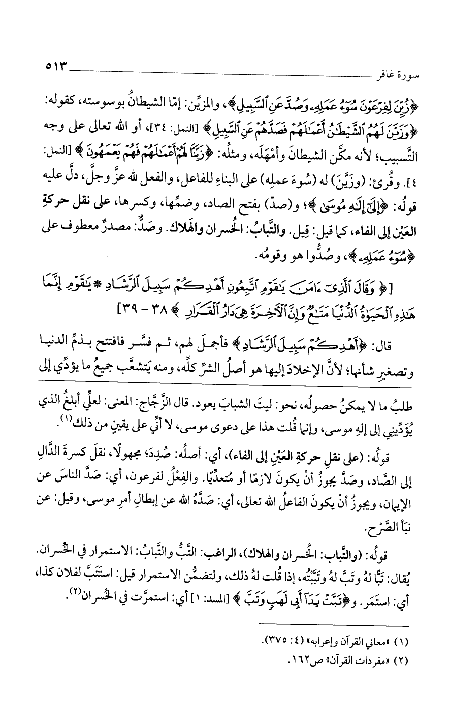 {زُيِّنَ لِفِرْعَوْنَ سُوءُ عَمَلِهِ وصُدَّ عَنِ السَّبِيلِ}، والمزين: إما الشيطان بوسوسته، كقوله: {وَزَيَّنَ لَهُمُ الشَّيْطَانُ أَعْمَالَهُمْ فَصَدَّهُمْ عَنِ السَّبِيلِ} [النمل: 24]، أو الله تعالى على وجه التسبيب؛ لأنه مكن الشيطان وأمهله، ومثله: {زَيَّنَّا لَهُمْ أَعْمَالَهُمْ فَهُمْ يَعْمَهُونَ} [النمل: 4]. وقرئ: (وزين) له (سوء عمله) على البناء للفاعل، والفعل لله عز وجل، دل عليه قوله: {إلَى إلَهِ مُوسَى}؛ و (صد) بفتح الصاد، وضمها، وكسرها، على نقل حركة العين إلى الفاء، كما قيل: قيل. والتباب: الخسران والهلاك. وصد: مصدر معطوف على {سُوءُ عَمَلِهِ}، وصدوا هو وقومه.
