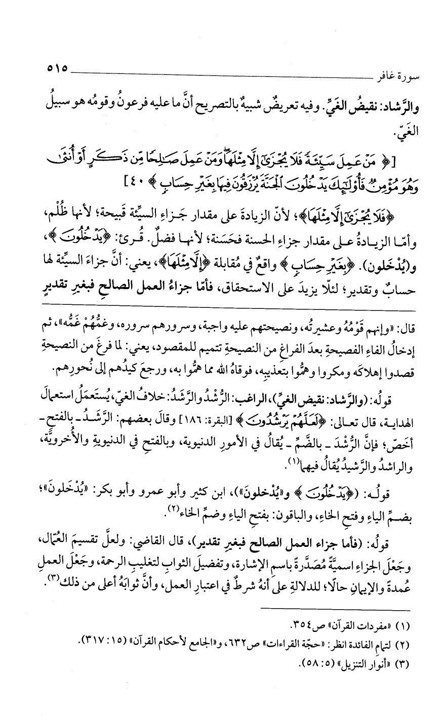 {فَلا يُجْزَى إلاَّ مِثْلَهَا}؛ لأن الزيادة على مقدار جزاء السيئة قبيحة؛ لأنها ظلم، وأما الزيادة على مقدار جزاء الحسنة فحسنة؛ لأنها فضل. قرئ: {يَدْخُلُونَ}، و (يدخلون). {بِغَيْرِ حِسَابٍ} واقع في مقابلة {إلاَّ مِثْلَهَا}، يعني: أن جزاء السيئة لها حساب وتقدير؛ لئلا يزيد على الاستحقاق، فأما جزاء العمل الصالح فبغير تقدير