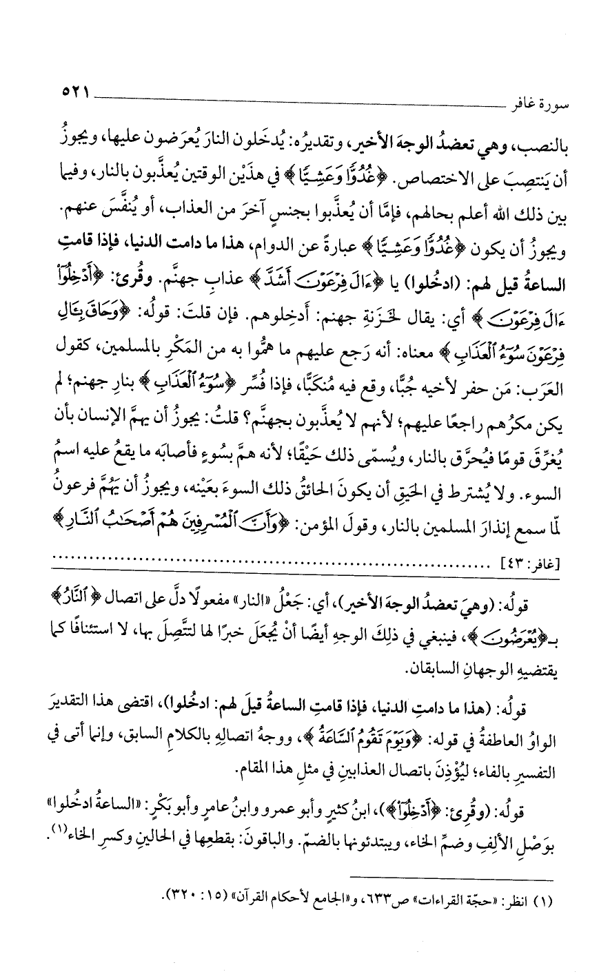 بالنصب، وهي تعضد الوجه الأخير، وتقديره: يدخلون النار يعرضون عليها، ويجوز أن ينتصب على الاختصاص. {غُدُوًا وعَشِيًا} في هذين الوقتين يعذبون بالنار، وفيما بين ذلك الله أعلم بحالهم، فإما أن يعذبوا بجنس آخر من العذاب، أو ينفس عنهم. ويجوز أن يكون {غُدُوًا وعَشِيًا} عبارة عن الدوام، هذا مادامت الدنيا، فإذا قامت الساعة قبل لهم: (ادخلوا) يا {آلَ فِرْعَوْنَ أَشَدَّ} عذاب جهنم. وقرئ: {أَدْخِلُوا آلَ فِرْعَوْنَ} أي: يقال لخزنة جهنم: أدخلوهم. فإن قلت: قوله: {وحَاقَ بِآلِ فِرْعَوْنَ سُوءُ العَذَابِ} معناه: أنه رجع عليهم ما هموا به من المكر بالمسلمين، كقول العرب: من حفر لأخيه جبا، وقع فيه منكبا، فإذا فسر {سُوءُ العَذَابِ} بنار جهنم؛ لم يكن مكرهم راجعًا عليهم؛ لأنهم لا يعذبون بجهنم؟ قلت: يجوز أن يهم الإنسان بأن يغرق قوما فيحرق بالنار، ويسمى ذلك حيقا؛ لأنه هم بسوء فأصابه ما يقع عليه اسم السوء. ولا يشترط في الحيق أن يكون الحائق ذلك السوء بعينه، ويجوز أن يهم فرعون لما سمع إنذار المسلمين بالنار، وقول المؤمن: {وأَنَّ المُسْرِفِينَ هُمْ أَصْحَابُ النَّارِ} [غافر: 43] .....