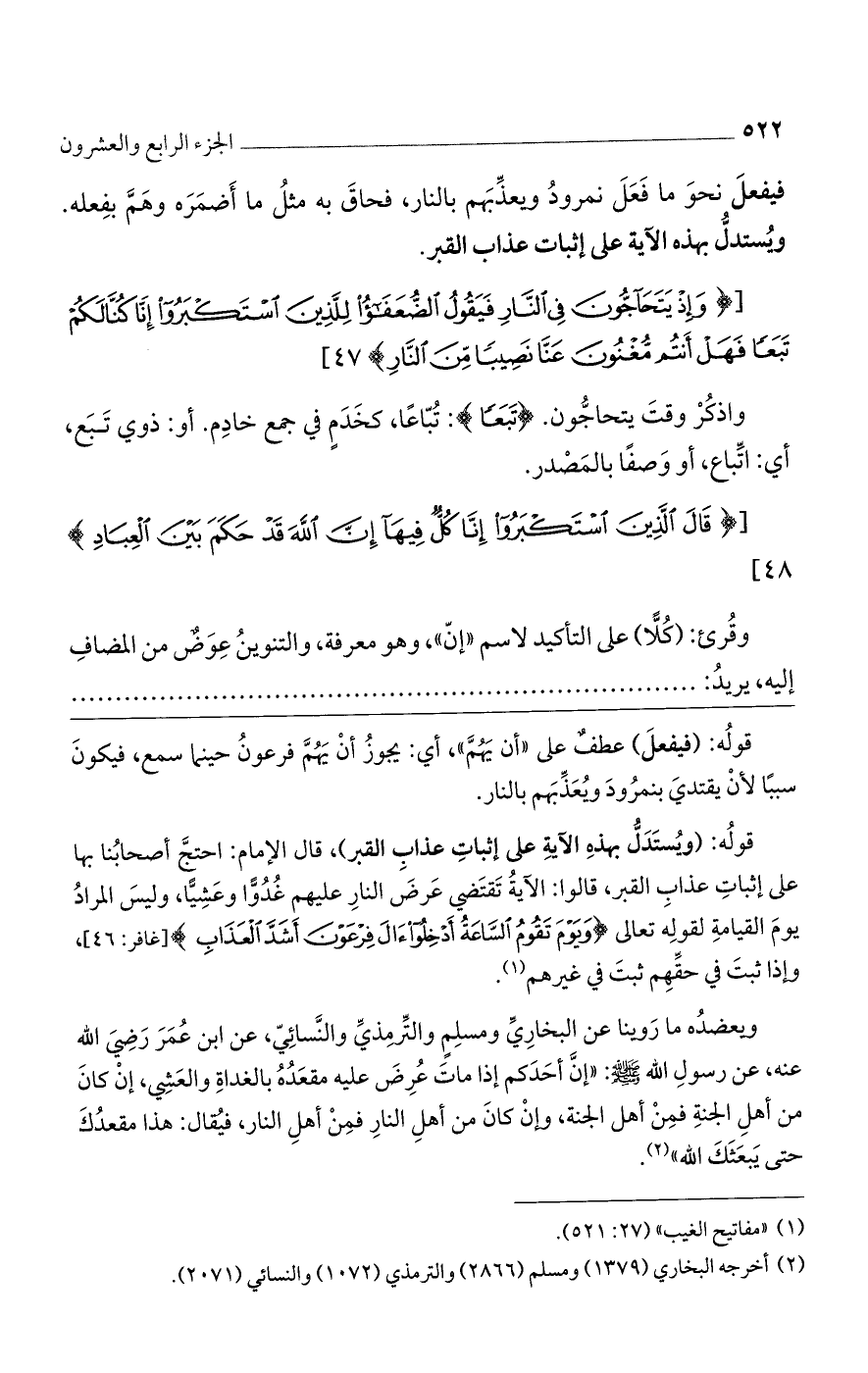 قوله: (ويستدل بهذا الآية على إثبات عذاب القبر)، قال الإمام: احتج أصحابنا بها على إثبات عذاب القبر، قالوا: الآية تقضي عرض النار عليهم غدوا وعشيًا، وليس المراد يوم القيامة لقوله تعالى {ويَوْمَ تَقُومُ السَّاعَةُ أَدْخِلُوا آلَ فِرْعَوْنَ أَشَدَّ العَذَابِ} [غافر: 46]، وإذا ثبت في حقهم ثبت في غيرهم.