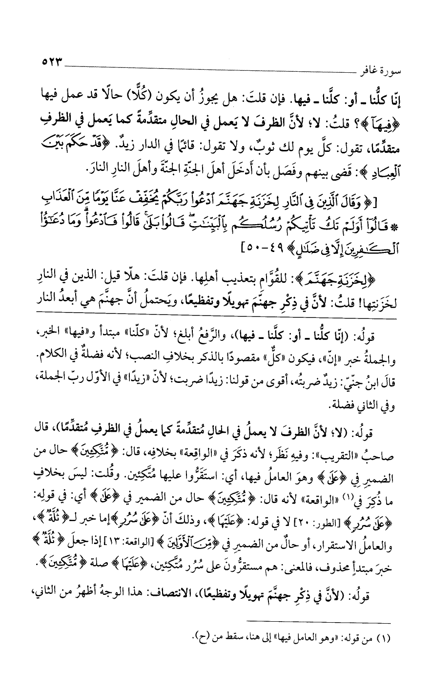 قوله: (لا؛ لأن الظرف لا يعمل في الحال متقدمة كما يعمل في الظرف متقدمًا)، قال صاحب"التقريب": وفيه نظر؛ لأنه ذكر في "الواقعة" بخلافه، قال: {مُتَّكِئِينَ} حال من الضمير في {عَلَى} وهو العامل فيها، أي: استقروا عليها متكئين. وقلت: ليس بخلاف ما ذكر في "الواقعة" لأنه قال: {مُتَّكِئِينَ} حال من الضمير في {عَلَى} أي: في قوله: {عَلَى سُرُرٍ} [الطور: 20] لا في قوله: {عَلَيْهَا}، وذلك أن {عَلَى سُرُرٍ} إما خبر لـ {ثُلَّةٌ}، والعامل الاستقرار، أو حال من الضمير في {مِنَ الْأَوَّلِينَ} [الواقعة: 13] إذا جعل {ثُلَّةٌ} خبر مبتدأ محذوف، فالمعنى: هم مستقرون على سرر متكئين، {عَلَيْهَا} صلة {مُتَّكِئِينَ}.
