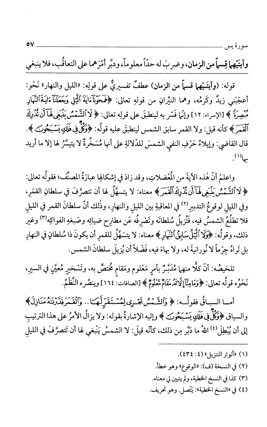واعلم أن هذه الآية من المعضلات، وقد زاد في إشكالها عبارة المصنف؛ فقوله تعالى: {لا الشَّمْسُ يَنْبَغِي لَهَا أَن تُدْرِكَ القَمَرَ} معناه: لا يتسهل لها أن تتصرف في سلطان القمر، وفي الليل لوقوع التدبير في المعاقبة بين الليل والنهار، وذلك أن سلطان القمر في الليل فلا تطلع الشمس فيه، فتزيل سلطانه وتصرفه عن مطارح ضيائه وصبغه الفواكه وغير ذلك، وقوله: {ولا اللَّيْلُ سَابِقُ النَّهَارِ} معناه: لا يتسهل للقمر أن يكون ذا سلطان في النهار بل تراه جرمًا لا نورانية له، ولا بهاء فيه، فضلًا أن يزيل سلطان الشمس.