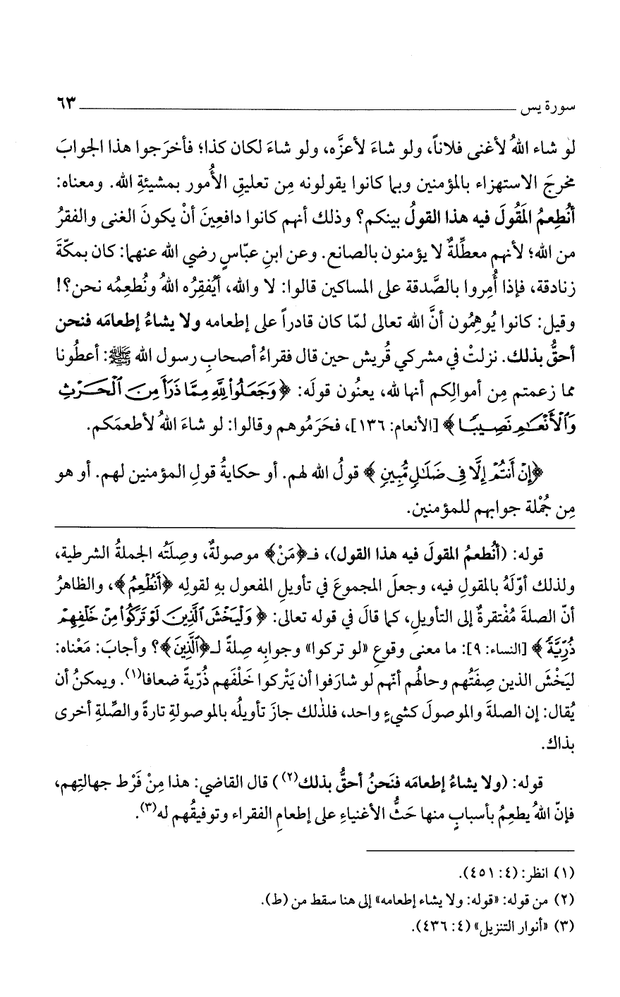 قوله: (أنطعم المقول فيه هذا القول)، فـ {مَنْ} موصولة، وصلته الجملة الشرطية، ولذلك أوله بالمقول فيه، وجعل المجموع في تأويل المفعول به لقوله {أَنُطْعِمُ}، والظاهر أن الصلة مفتقرة إلى التأويل، كما قال في قوله تعالى: {وَلْيَخْشَ الَّذِينَ لَوْ تَرَكُوا مِنْ خَلْفِهِمْ ذُرِّيَّةً} [النساء: 9]: ما معنى وقوع "لو تركوا" وجوابه صلة لـ {الَّذِينَ}؟ وأجاب: معناه: ليخش الذين صفتهم وحالهم أتهم لو شارفوا أن يتركوا خلفهم ذرية ضعافًا. ويمكن أن يقال: إن الصلة والموصول كشيء واحد، فلذلك جاز تأويله بالموصولة تارة والصلة أخرى بذاك.