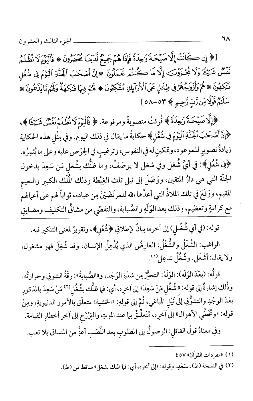 {إلاَّ صَيْحَةً واحِدَةً} قرئت منصوبة ومرفوعة. {فَالْيَوْمَ لا تُظْلَمُ نَفْسٌ شَيْئًا}، {إنَّ أَصْحَابَ الجَنَّةِ اليَوْمَ فِي شُغُلٍ} حكاية ما يقال في ذلك اليوم. وفي مثل هذه الحكاية زيادة تصوير للموعود، وتمكين له في النفوس، وترغيب في الحرص عليه وعلى ما يثمره. {فِي شُغُلٍ}: في أي شغل وفي شغل لا يوصف، وما ظنك بشغل من سعد بدخول الجنة التي هي دار المتقين، ووصل إلى نيل تلك الغبطة وذلك الملك الكبير والنعيم المقيم، ووقع في تلك الملاذ التي أعدها الله للمرتضين من عباده، ثوابًا لهم على أعمالهم مع كرامة وتعظيم، وذلك بعد الوله والصبابة، والتفصي من مشاق التكليف ومضايق