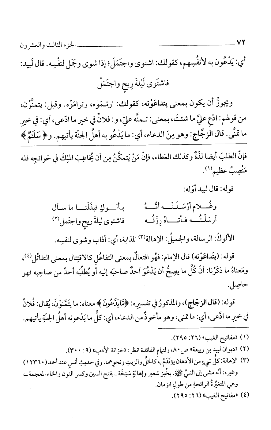 ويجوز أن يكون بمعنى يتداعونه، كقولك: ارتموه، وتراموه. وقيل: يتمنون، من قولهم: ادع علي ما شئت، بمعنى: تمنه علي، و: فلان في خير ما ادعى، أي: في خير ما تمنى. قال الزجاج: وهو من الدعاء، أي: ما يدعوا به أهل الجنة يأتيهم. و {سَلَامٌ}
