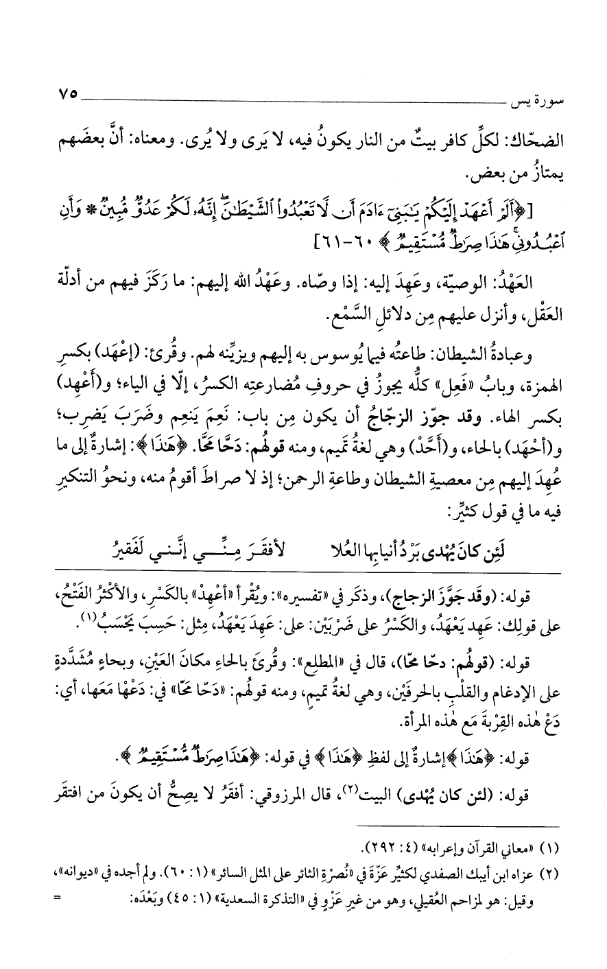 وعبادة الشيطان: طاعته فيما يوسوس به إليهم ويزينه لهم. وقرئ: (إعهد) بكسر الهمزة، وباب "فعل" كله يجوز في حروف مضارعته الكسر، إلا في الياء؛ و (أعهد) بكسر الهاء. وقد جوز الزجاج أن يكون من باب: نعم بنعم وضرب يضرب؛ و (أحهد) بالحاء، و (أحد) وهي لغة تميم، ومنه قولهم: دحامحًا. {هَذَا}: إشارة إلى ما عهد إليهم من معصية الشيطان وطاعة الرحمن؛ إذ لا صراط أقوم منه، ونحو التنكير فيه ما في قول كثير: