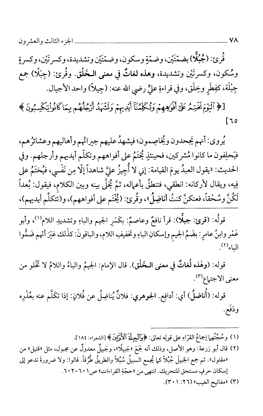 قوله: (قرئ: جبلًا): قرأ نافع وعاصم: بكسر الجيم والباء وتشديد اللام، وأبو عمر وابن عامر: بضم الجيم وإسكان الباء وتخفيف اللام، والباقون: كذلك غير أنهم ضموا الباء.