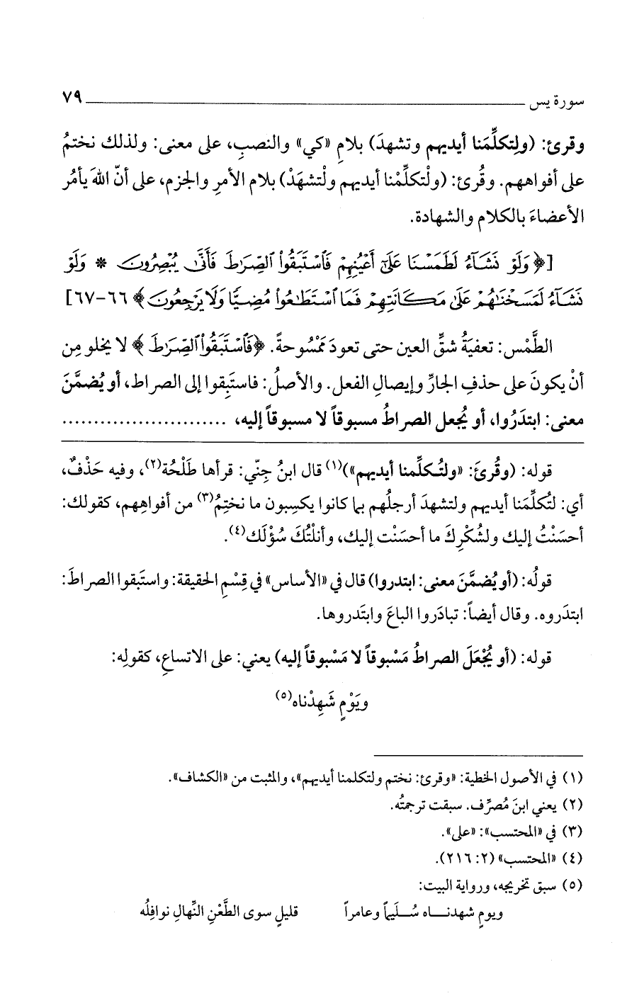 قوله: (وقرئ: "ولتكلمنا أيديهم") قال ابن جني: قرأها طلحة، وفيه حذف أي: لتكلمنا أيديهم ولتشهد أرجلهم بما كانوا يكسبون ما نختم من أفواههم، كقولك: أحسنت إليك ولشرك ما أحسنت إليك، وأنلتك سؤلك.
