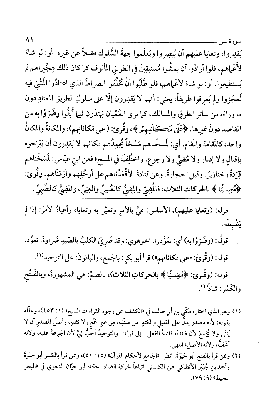 يقدروا، وتعايا عليهم أن يبصروا ويعلموا جهة السلوك فضلًا عن غيره. أو: لو شاء لأعماهم، فلوا أرادوا أن يمشوا مستبقين في الطريق المألوف كما كان ذلك هجيراهم لم يستطيعوا. أو: لو شاء لأعماهم، فلو طلبوا أن يخلفوا الصراط الذي اعتادوا المشي فيه لعجزوا ولم يعرفوا طريقًا، يعني: أنهم لا يقدرون إلًا على سلوك الطريق المعتاد دون ما وراءه من سائر الطريق والمسالك، كما ترى العميان يهتدون فيها ألفوا وضروا به من المقاصد دون غيرها. {عَلَى مَكَانَتِهِمْ}، وقرئ: (على مكاناتهم)، والمكانة والمكان واحد، كالمقامة والمقام. أي: لمسخناهم مسخًا يجمدهم مكانهم لا يقدرون أن يبرحوه بإقبال ولا إدبار ولا مضي ولا رجوع. واختلف في المسخ؛ فعن ابن عباس: لمسخناهم قردة وخنازير. وقيل: حجارة. وعن قتادة: لأقعدناهم على أرجلهم وأزمناهم. وقرئ: {مُضِيًا} بالحركات الثلاث، فالمضي والمضي كالعتي والعتي، والمضي كالصبي.