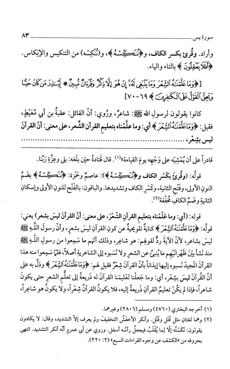 قوله: (وقرئ بكسر الكاف و {نُنَكِّسْهُ}): عاصم وحمزة: {نُنَكِّسْهُ} بضم النون الأولى، وفتح الثانية، وكسر الكاف وتشديدها. والباقون: بالفتح للنون الأولى وإسكان الثانية وضم الكاف مخففة.