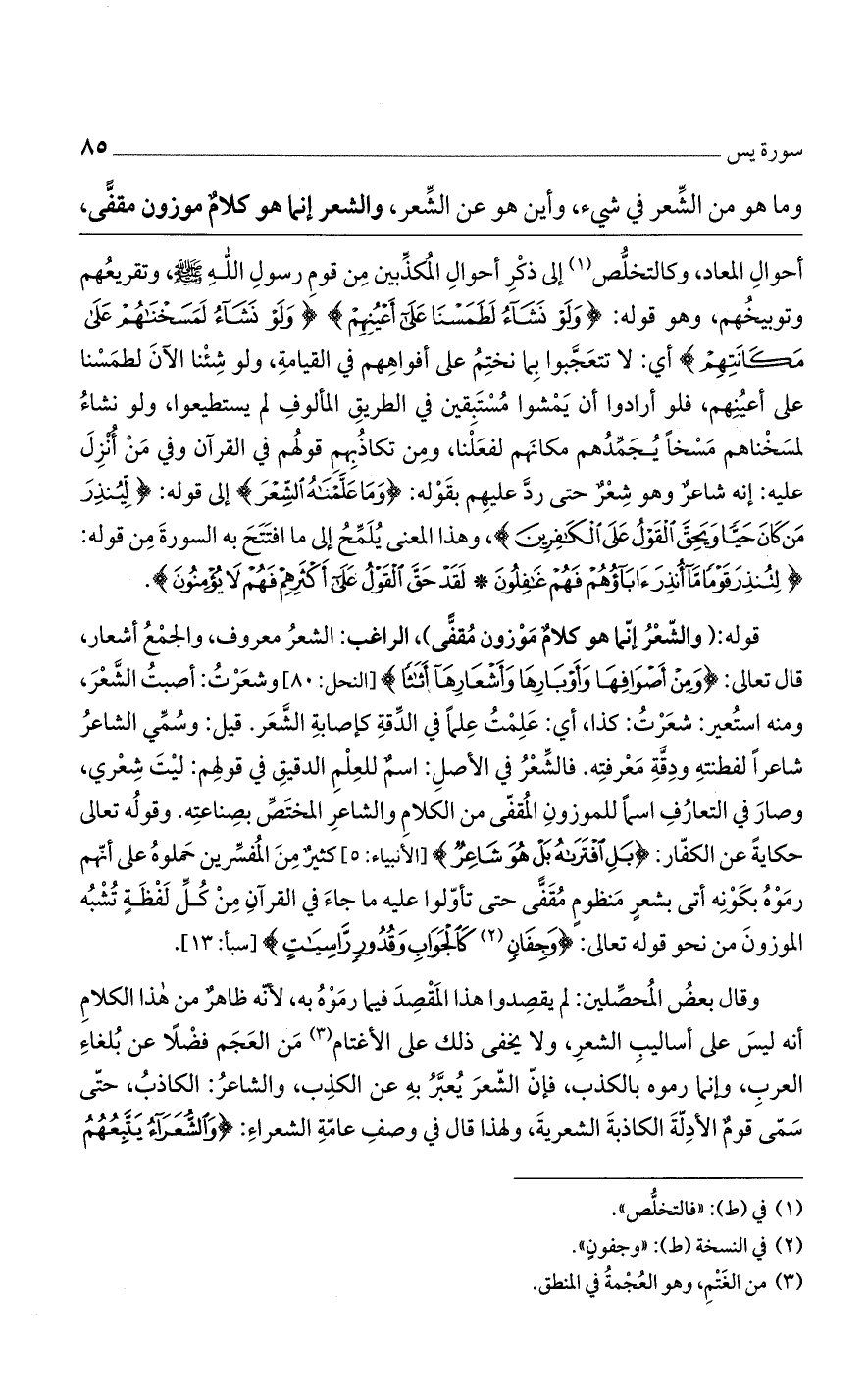 قوله: (والشعر إنما هو كلام موزون مقفى)، الراغب: الشعر معروف، والجمع أشعار، قال تعالى: {وَمِنْ أَصْوَافِهَا وَأَوْبَارِهَا وَأَشْعَارِهَا أَثَاثًا} [النحل: 80] وشعرت: أصبت الشعر، ومنه استعير، شعرت: كذا، أي: علمت علمًا في الدقة كإصابة الشعر. قيل: وسمي الشاعر شاعرًا لفطنته ودقة معرفته. فالشعر في الأصل: اسم للعلم الدقيق في قولهم: ليت شعري، وصار في التعارف اسمًا للموزون المقفى من الكلام والشاعر المختص بصناعته. وقوله تعالى حكاية عن الكفار: {بَلِ افْتَرَاهُ بَلْ هُوَ شَاعِرٌ} [الأنبياء: 5] كثير من المفسرين حملوه على أنهم رموه بكونه أتى بشعر منظوم مقفى حتى تأولوا عليه ما جاء في القرآن من كل لفظة تشبه الموزون من نحو قوله تعالى: {وَجِفَانٍ كَالْجَوَابِ وَقُدُورٍ رَاسِيَاتٍ} [سبأ: 13].