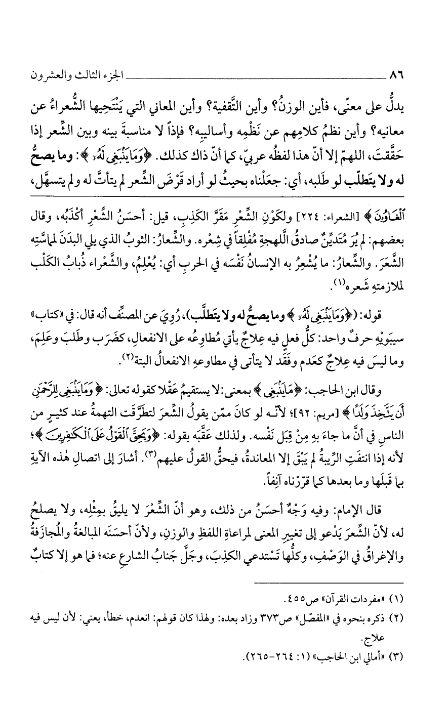 وقال ابن الحاجب: {مَا يَنْبَغِي} بمعنى: لا يستقيم عقلا كقوله تعالى: {وَمَا يَنْبَغِي لِلرَّحْمَنِ أَنْ يَتَّخِذَ وَلَدًا} [مريم: 92]؛ لأنه لو كان ممن يقول الشعر لتطرقت التهمة عند كثير من الناس في أن ما جاء به من قبل نفسه. ولذلك عقبه بقوله: {ويَحِقَّ القَوْلُ عَلَى الكَافِرِينَ}؛ لأنه إذا انتفت الريبة لم يبق إلا المعاندة، فيحق القول عليهم. أشار إلى اتصال هذا الآية بما قبلها وما بعدها كما قررناه آنفًا.