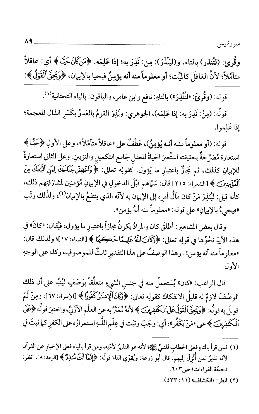 وقرئ: (لتنذر) بالتاء، و (لينذر): من: نذر به؛ إذا علمه. {مَن كَانَ حَيًا} أي: عاقلًا متأملًا؛ لأن الغافل كالميت؛ أو معلومًا منه أنه يؤمن فيحيا بالإيمان، {ويَحِقَّ القَوْلُ}: