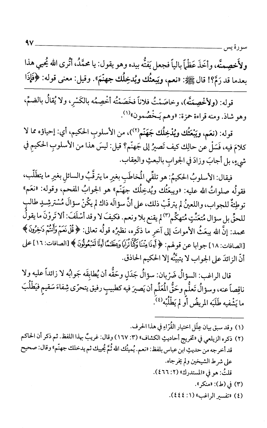 فيقال: الأسلوب الحكيم: هو تلقي المخاطب بغير ما يترقب والسائل بغير ما يتطلب، فقوله صلوات الله عليه: " ويبعثك ويدخلك جهنم" هو الجواب المفحم، وقوله: "نعم" توطئة للجواب، واللعين لم يترقب ذلك، على أن سؤاله ذاك لم يكن سؤال مسترشد طالب للحق بل سؤال متعنت متهكم لم يقنع بلا ونعم. فكيف لا وقد أسلف: ألا ترون ما يقول محمد: إن الله يبعث الأموات إلى آخر ما ذكره، نظيره قوله تعالى: {قُلْ نَعَمْ وَأَنْتُمْ دَاخِرُونَ} [الصافات: 18] جوابًا عن قولهم: {أَئِذَا مِتْنَا وَكُنَّا تُرَابًا وَعِظَامًا أَئِنَّا لَمَبْعُوثُونَ} [الصافات: 16] على أن الزائد على الجواب لا يتبينه إلا الحكيم الحاذق.