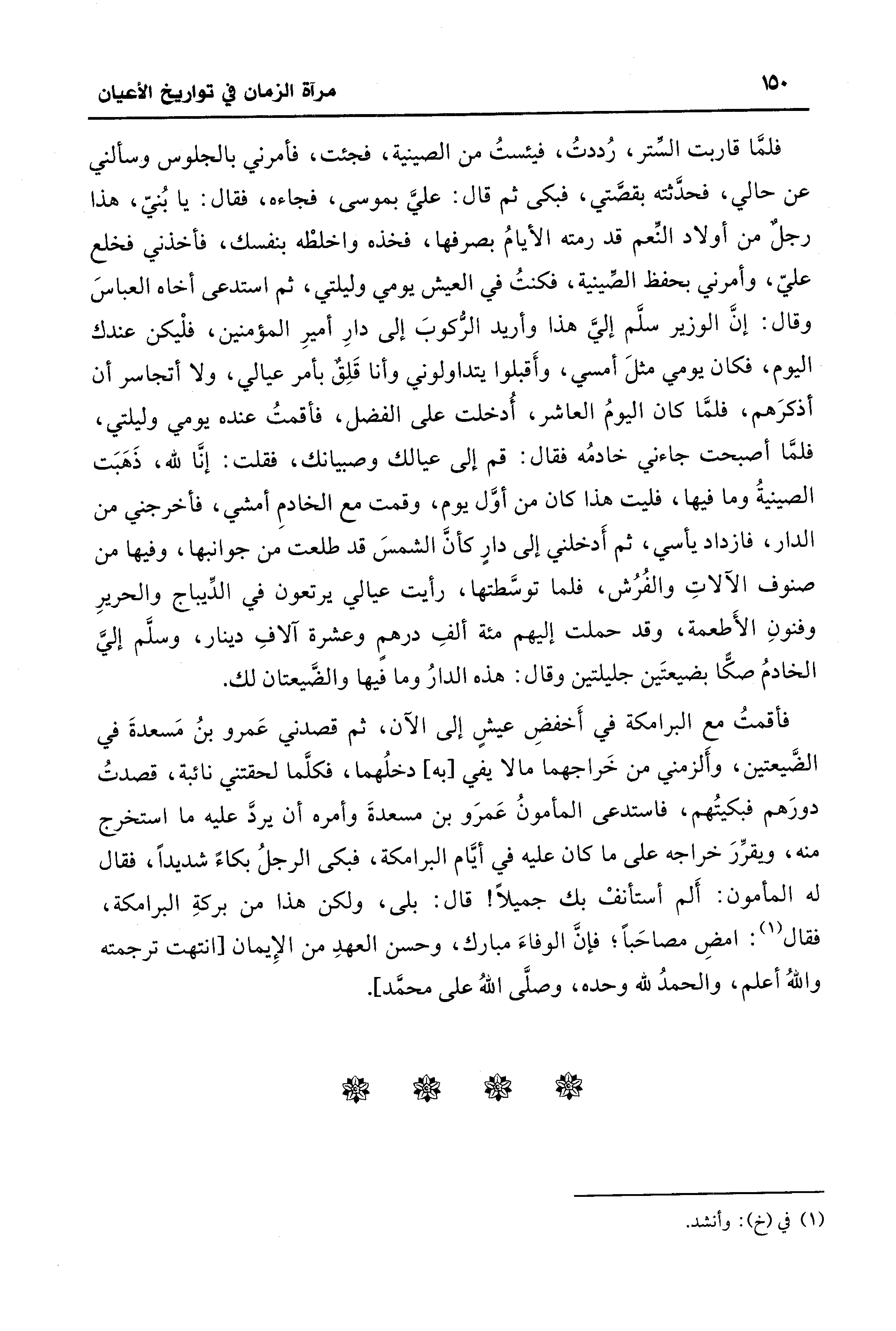 فأقمتُ مع البرامكة في أَخفضِ عيشٍ إلى الآن، ثم قصدني عَمرو بنُ مَسعدةَ في الضَّيعتين، وأَلزمني من خَراجهما ما لا يفي [به] دخلُهما، فكلَّما لحقتني نائبة، قصدتُ دورَهم فبكيتُهم، فاستدعى المأمونُ عَمرَو بن مسعدةَ وأمره أن يردَّ عليه ما استخرج منه، ويقرِّرَ خراجه على ما كان عليه في أيَّام البرامكة، فبكى الرجلُ بكاءً شديدًا، فقال له المأمون: أَلم أستأنفْ بك جميلًا! قال: بلى، ولكن هذا من بركةِ البرامكة، فقال (¬1): امضِ مصاحَبًا؛ فإن الوفاءَ مبارك، وحسن العهدِ من الإِيمان [انتهت ترجمته واللهُ أعلم، والحمدُ لله وحده، وصلَّى اللهُ على محمَّد].
