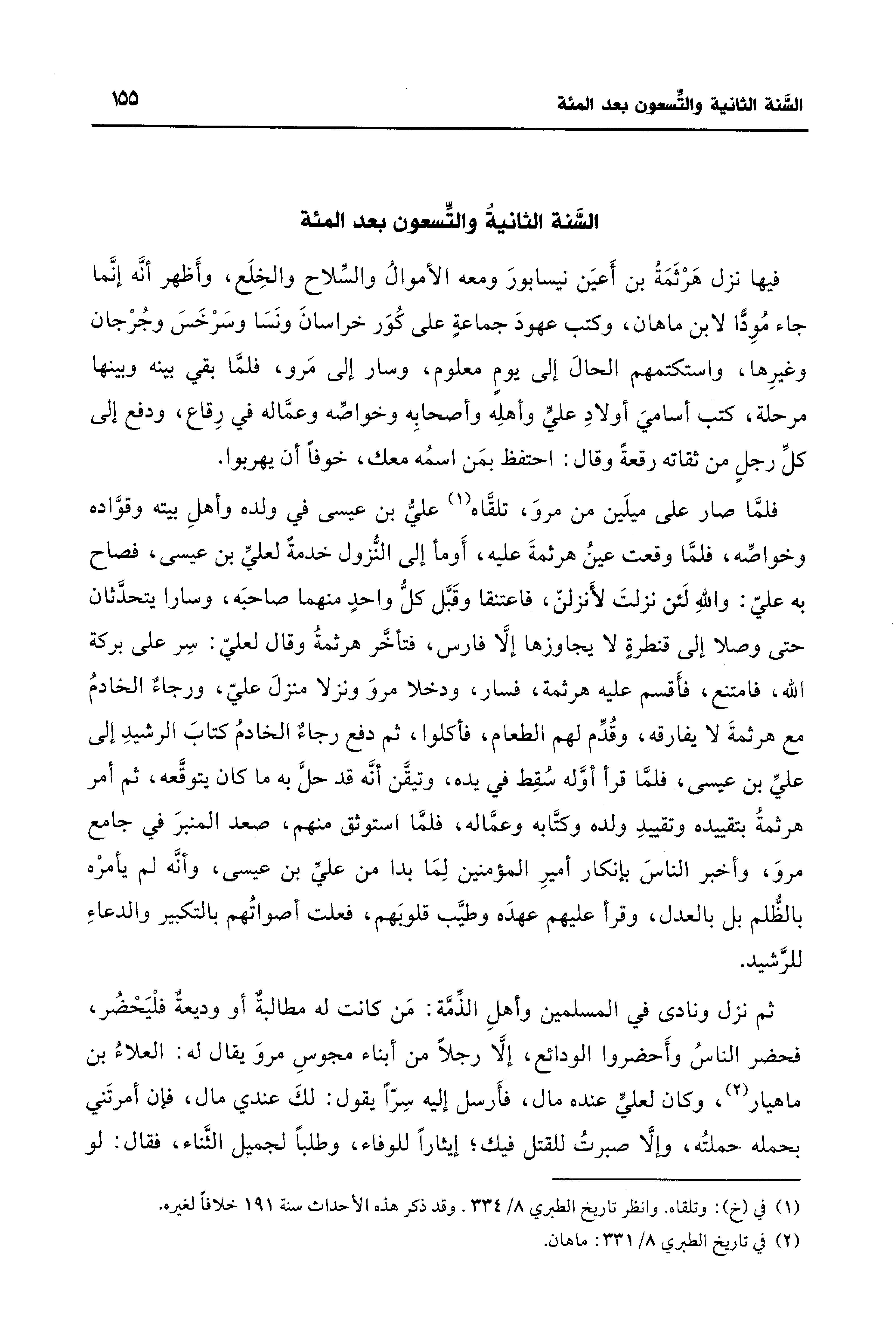 فيها نزل هَرْثَمَةُ بن أَعيَن نيسابورَ ومعه الأموالُ والسِّلاح والخِلَع، وأَظهر أنَّه إنَّما جاء مُوِدًّا لابن ماهان، وكتب عهودَ جماعةٍ على كُوَر خراسانَ ونَسَا وسَرْخَسَ وجُرْجان وغيرِها، واستكتمهم الحال إلى يومٍ معلوم، وسار إلى مَرو، فلمَّا بقي بينه وبينها مرحلة، كتب أساميَ أولادِ علي وأهلِه وأصحابِه وخواصِّه وعمَّاله في رِقاع، ودفع إلى كلِّ رجلٍ من ثقاته رقعةً وقال: احتفظ بمَن اسمُه معك، خوفًا أن يهربوا.
