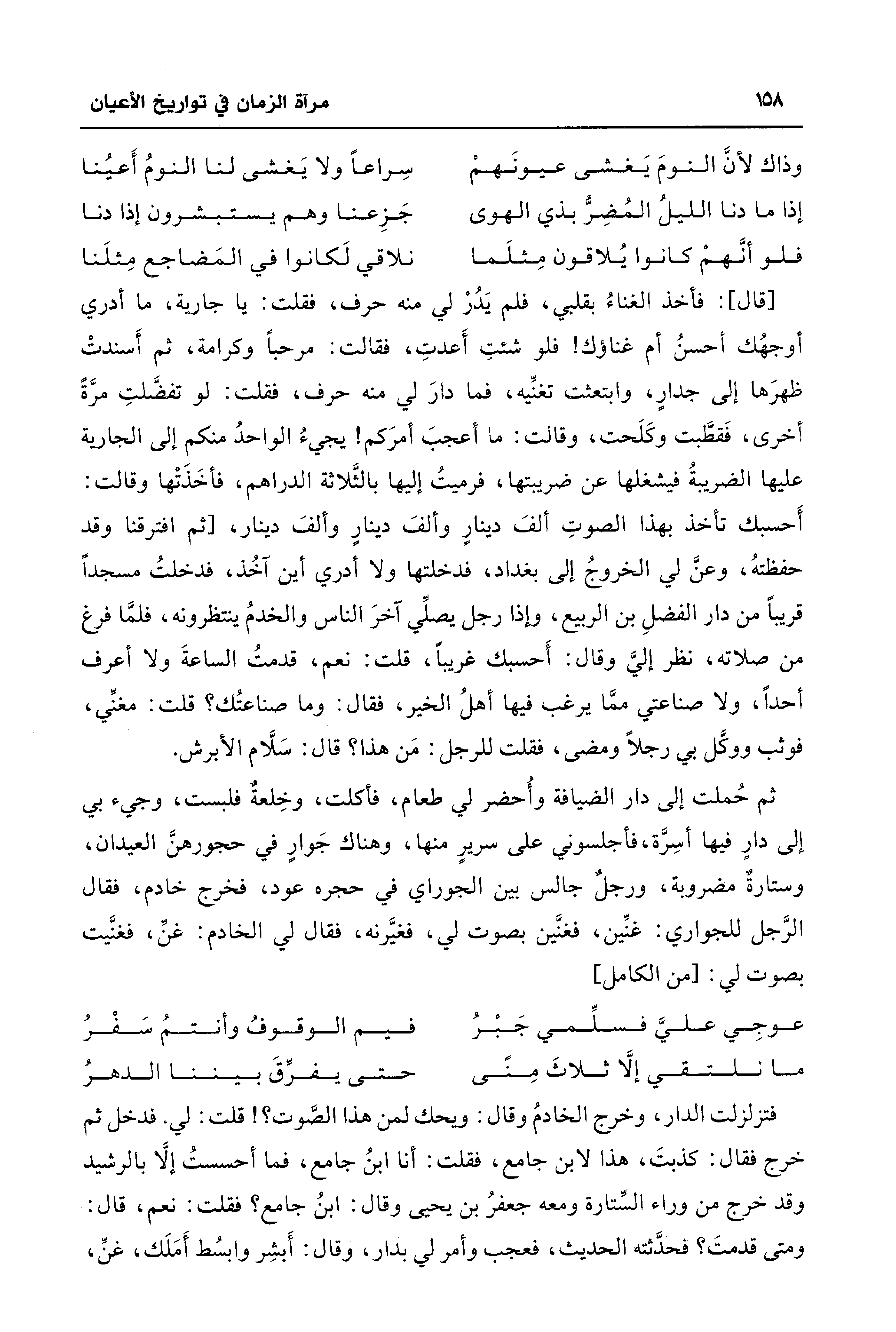 ثم حُملت إلى دار الضيافة وأُحضر لي طعام، فأكلت، وخِلعةٌ فلبست، وجيء بي إلى دار فيها أسِرَّة، فأجلسوني على سريرٍ منها، وهناك جَوارٍ في حجورهنَّ العيدان، وستارةٌ مضروبة، ورجل جالس بين الجوراي في حجره عود، فخرج خادم، فقال الرَّجل للجواري: غنِّين، فغنَّين بصوت لي، فغيَّرنه، فقال لي الخادم: غنِّ، فغنَّيت بصوت لي: [من الكامل]