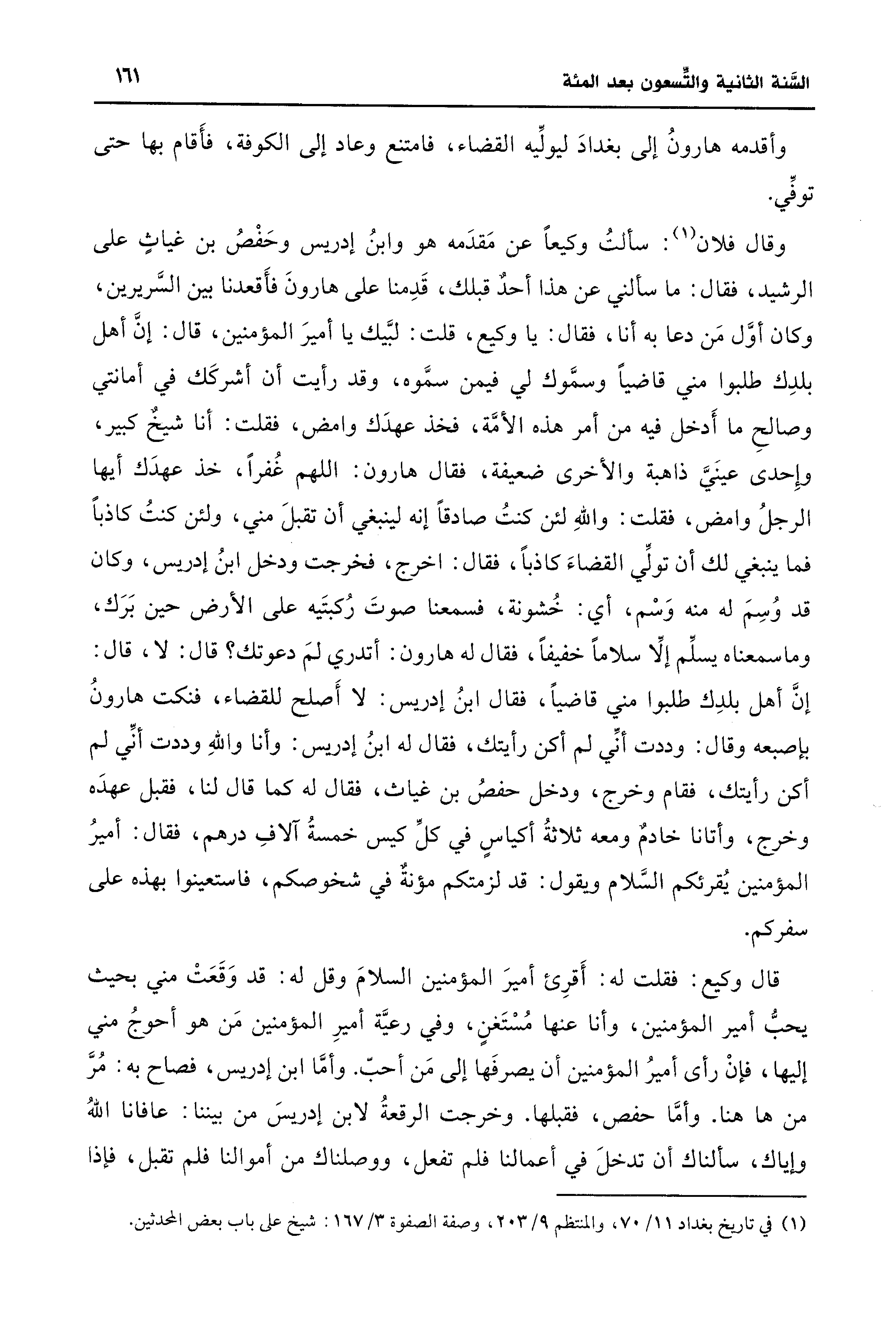 وقال فلان (¬1): سألت وكيعًا عن مَقدَمه هو وابنُ إدريس وحَفْصُ بن غياث على الرشيد، فقال: ما سألني عن هذا أحدٌ قبلك، قَدِمنا على هارونَ فأَقعدنا بين السَّريرين، وكان أوَّل مَن دعا به أنا، فقال: يا وكيع، قلت: لبَّيك يا أميرَ المؤمنين، قال: إن أهل بلدِك طلبوا مني قاضيًا وَسمَّوك لي فيمن سمَّوه، وقد رأيت أن أشركَك في أمانتي وصالحِ ما أَدخل فيه من أمر هذه الأمَّة، فخذ عهدَك وامض، فقلت: أنا شيخٌ كبير، وإِحدى عينَيَّ ذاهبة والأخرى ضعيفة، فقال هارون: اللهم غُفرًا، خذ عهدَك أيها الرجلُ وامضى، فقلت: واللهِ لئن كنتُ صادقًا إنه لينبغي أن تقبلَ مني، ولئن كنتُ كاذبًا فما ينبغي لك أن تولِّي القضاءَ كاذبًا، فقال: اخرج، فخرجت ودخل ابنُ إدريس، وكان قد وُسِمَ له منه وَسْم، أي: خُشونة، فسمعنا صوتَ رُكبتَيه على الأرض حين بَرَك، وما سمعناه يسلّم إلّا سلامًا خَفيفًا، فقال له هارون: أتدري لمَ دعوتك؟ قال: لا، قال: إنَّ أهل بلدِك طلبوا مني قاضيًا، فقال ابنُ إدريس: لا أَصلح للقضاء، فنكت هارونُ بإصبعه وقال: وددت أنِّي لم أكن رأيتك، فقال له ابنُ إدريس: وأنا واللهِ وددت أنِّي لم أكن رأيتك، فقام وخرج، ودخل حفصُ بن غياث، فقال له كما قال لنا، فقبل عهدَه وخرج، وأتانا خادمٌ ومعه ثلاثةُ أكياسٍ في كلِّ كيس خمسةُ آلافِ درهم، فقال: أميرُ المؤمنين يُقرئكم السلام ويقول: قد لزمتكم مؤنةٌ في شخوصكم، فاستعينوا بهذه على سفركم.
