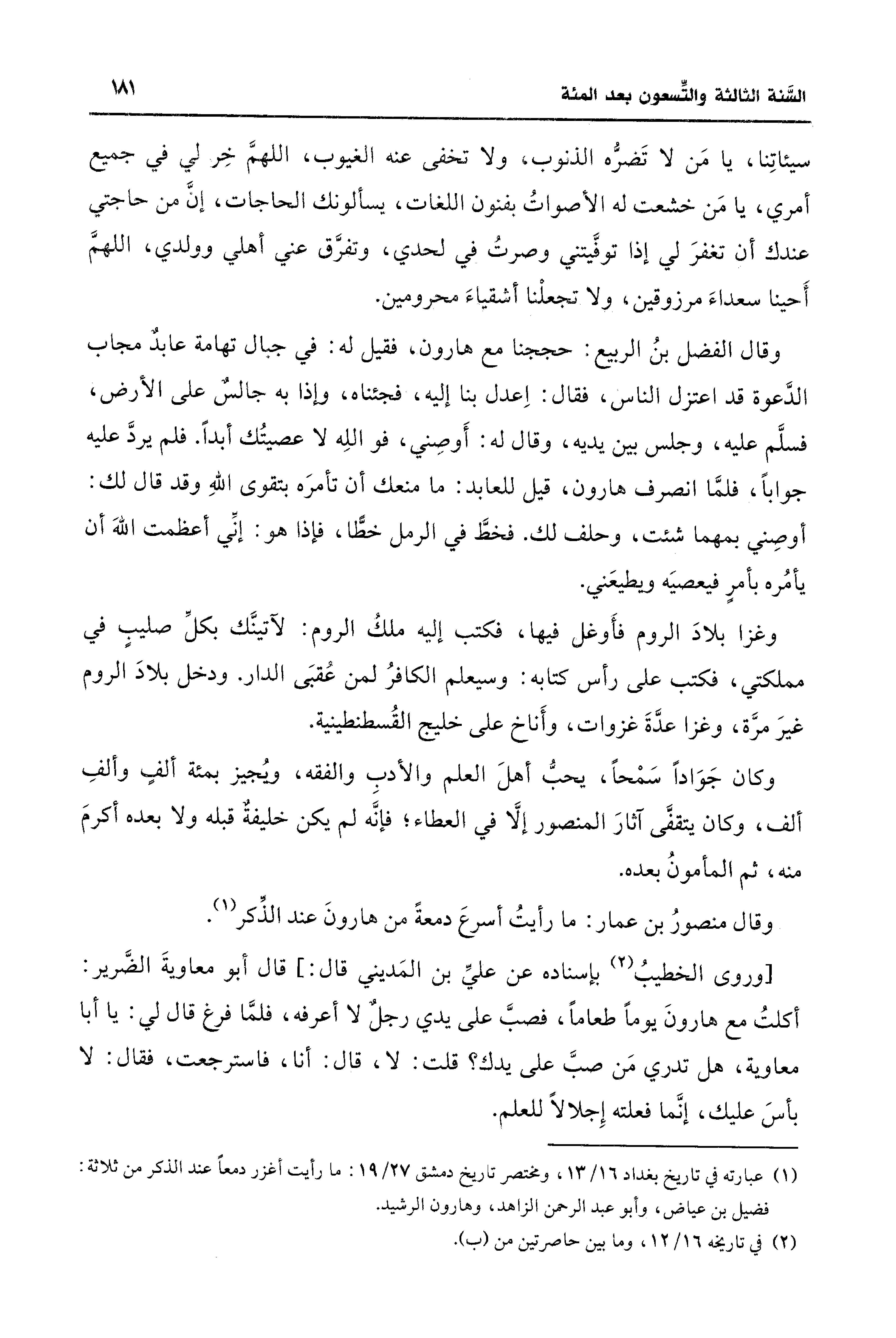 (¬1) عبارته في تاريخ بغداد 16/ 13، ومختصر تاريخ دمشق 27/ 19: ما رأيت أغزر دمعًا عند الذكر من ثلاثة: فضيل بن عياض، وأبو عبد الرحمن الزاهد، وهارون الرشيد.