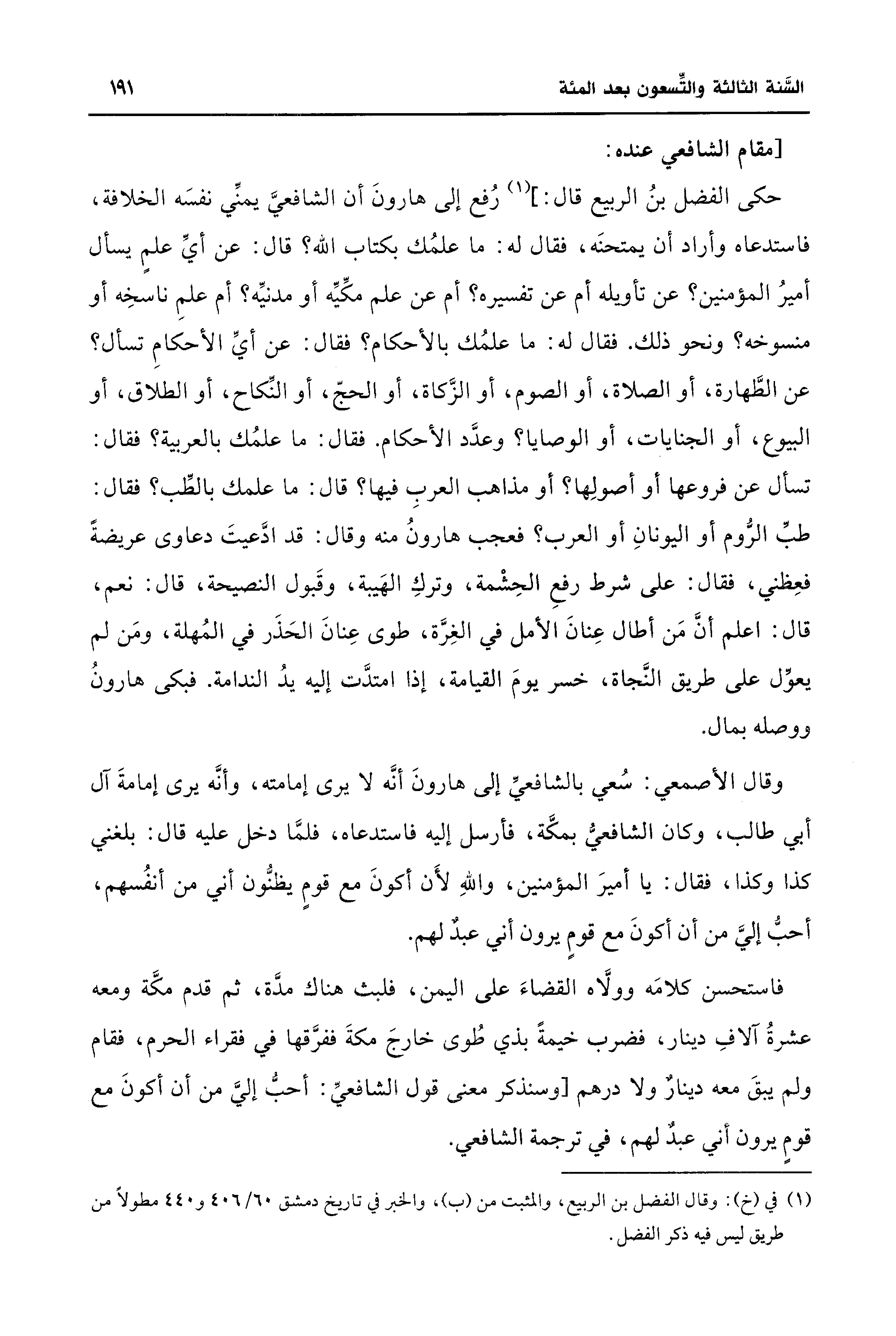 وقال الأصمعي: سُعي بالشافعيِّ إلى هارونَ أنَّه لا يرى إمامته، وأنَّه يرى إمامةَ آل أبي طالب، وكان الشافعيُّ بمكَّة، فأرسل إليه فاستدعاه، فلمَّا دخل عليه قال: بلغني كذا وكذا، فقال: يا أميرَ المؤمنين، واللهِ لأَن أكونَ مع قومٍ يظنُّون أني من أنْفُسهم، أحبُّ إليَّ من أَن أكونَ مع قومٍ يرون أني عبدٌ لهم.