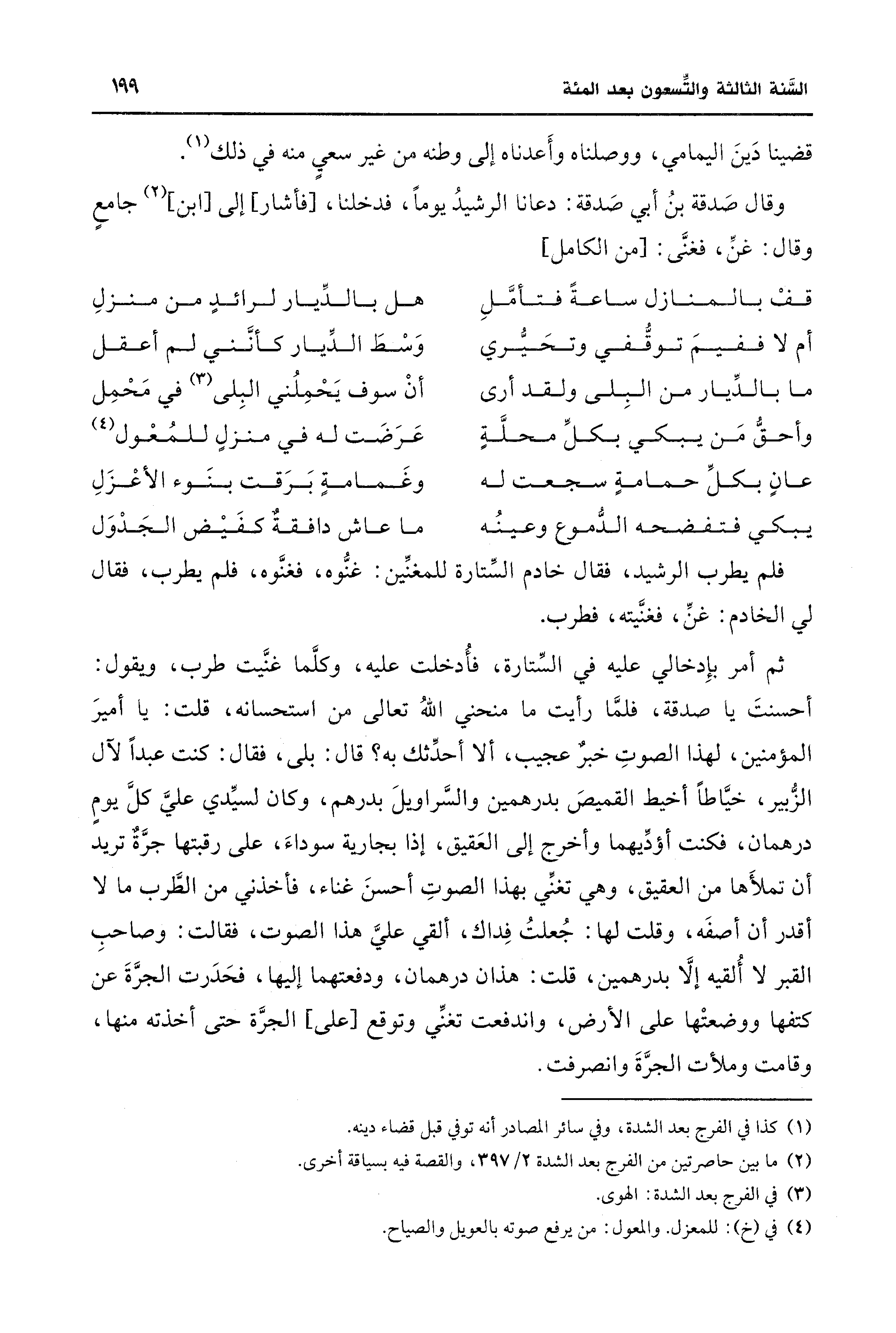 ثم أمر بإِدخالي عليه في السِّتارة، فأُدخلت عليه، وكلَّما غنَّيت طرب، ويقول: أحسنتَ يا صدقة، فلمَّا رأيت ما منحني اللهُ تعالى من استحسانه، قلت: يا أميرَ المؤمنين، لهذا الصوتِ خبرٌ عجيب، ألا أحدِّثك به؟ قال: بلى، فقال: كنت عبدًا لآل الزُّبير، خيَّاطًا أخيط القميصَ بدرهمين والسَّراويلَ بدرهم، وكان لسيِّدي عليَّ كلَّ يومٍ درهمان، فكنت أؤدِّيهما وأخرج إلى العَقيق، إذا بجارية سوداءَ، على رقبتها جرَّةٌ تريد أن تملأَها من العقيق، وهي تغنِّي بهذا الصوتِ أحسنَ غناء، فأخذني من الطَّرب ما لا أقدر أن أصفَه، وقلت لها: جُعلتُ فِداك، ألقي عليَّ هذا الصوت، فقالت: وصاحبِ القبر لا أُلقيه إلَّا بدرهمين، قلت: هذان درهمان، ودفعتهما إليها، فحَدَرت الجرَّةَ عن كتفها ووضعتْها على الأرض، واندفعت تغنِّي وتوقع [على] الجرَّة حتَّى أخذته منها، وقامت وملأت الجرَّةَ وانصرفت.