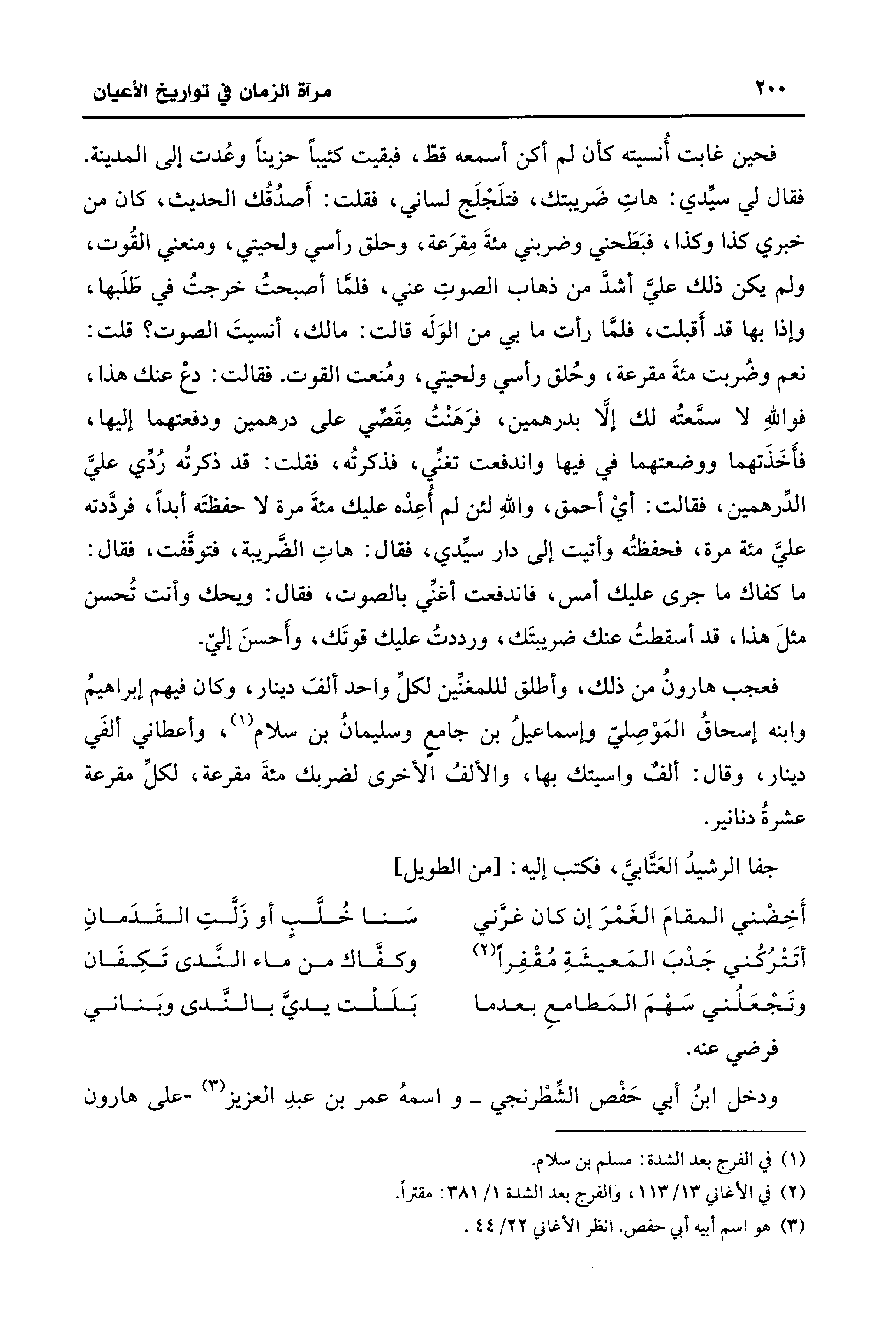فعجب هارونُ من ذلك، وأطلق للمغنِّين لكلِّ واحد ألفَ دينار، وكان فيهم إبراهيمُ وابنه إسحاقُ المَوْصِلي وإسماعيلُ بن جامع وسليمانُ بن سلام (¬1)، وأعطاني ألفَي دينار، وقال: ألفٌ واسيتك بها، والألفُ الأخرى لضربك مئةَ مقرعة، لكلِّ مقرعة عشرةُ دنانير.