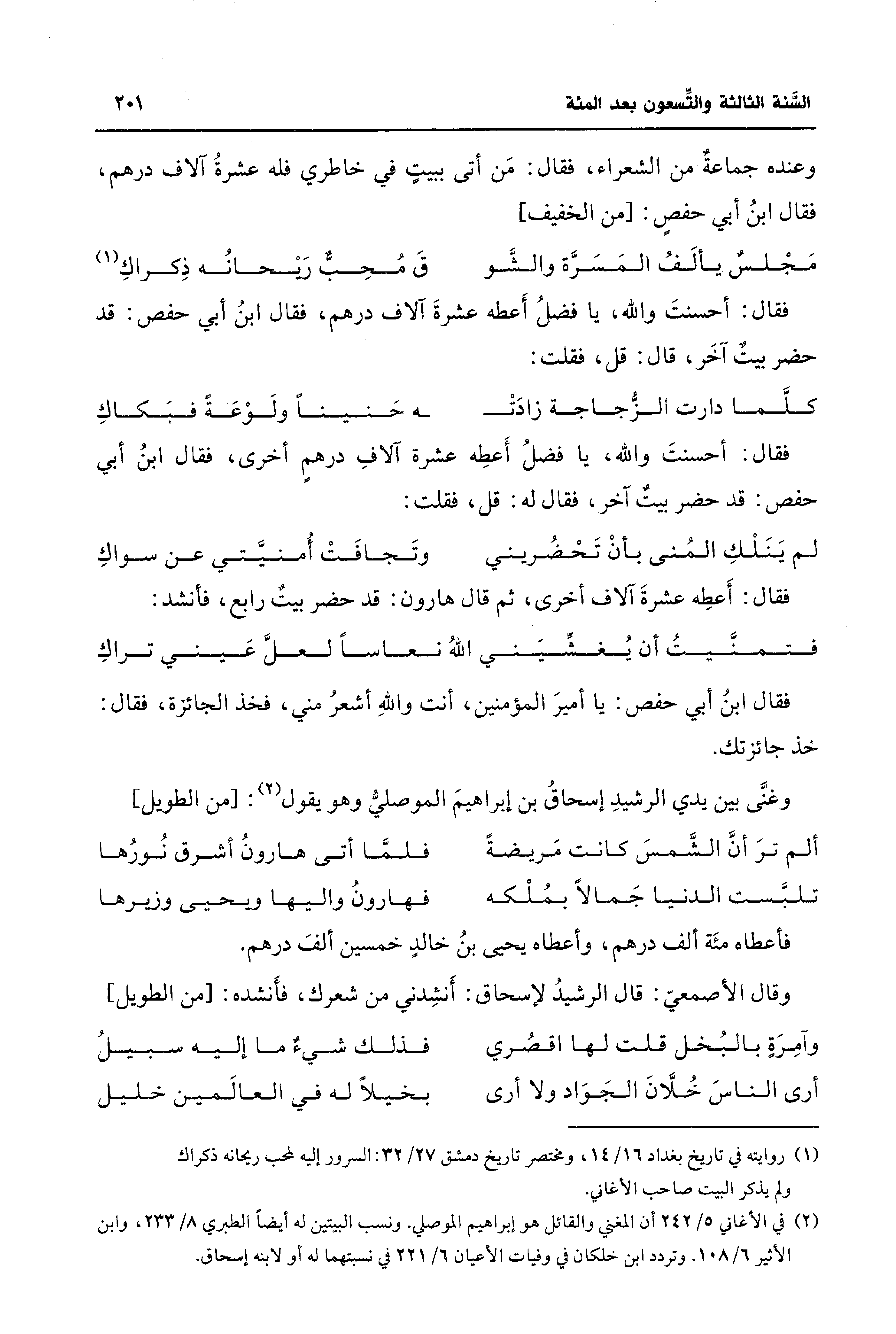 (¬2) في الأغاني 5/ 242 أن المغني والقائل هو إبراهيم الموصلي. ونسب البيتين له أيضًا الطبري 8/ 233، وابن الأثير 6/ 108. وتردد ابن خلكان في وفيات الأعيان 6/ 221 في نسبتهما له أو لابنه إسحاق.