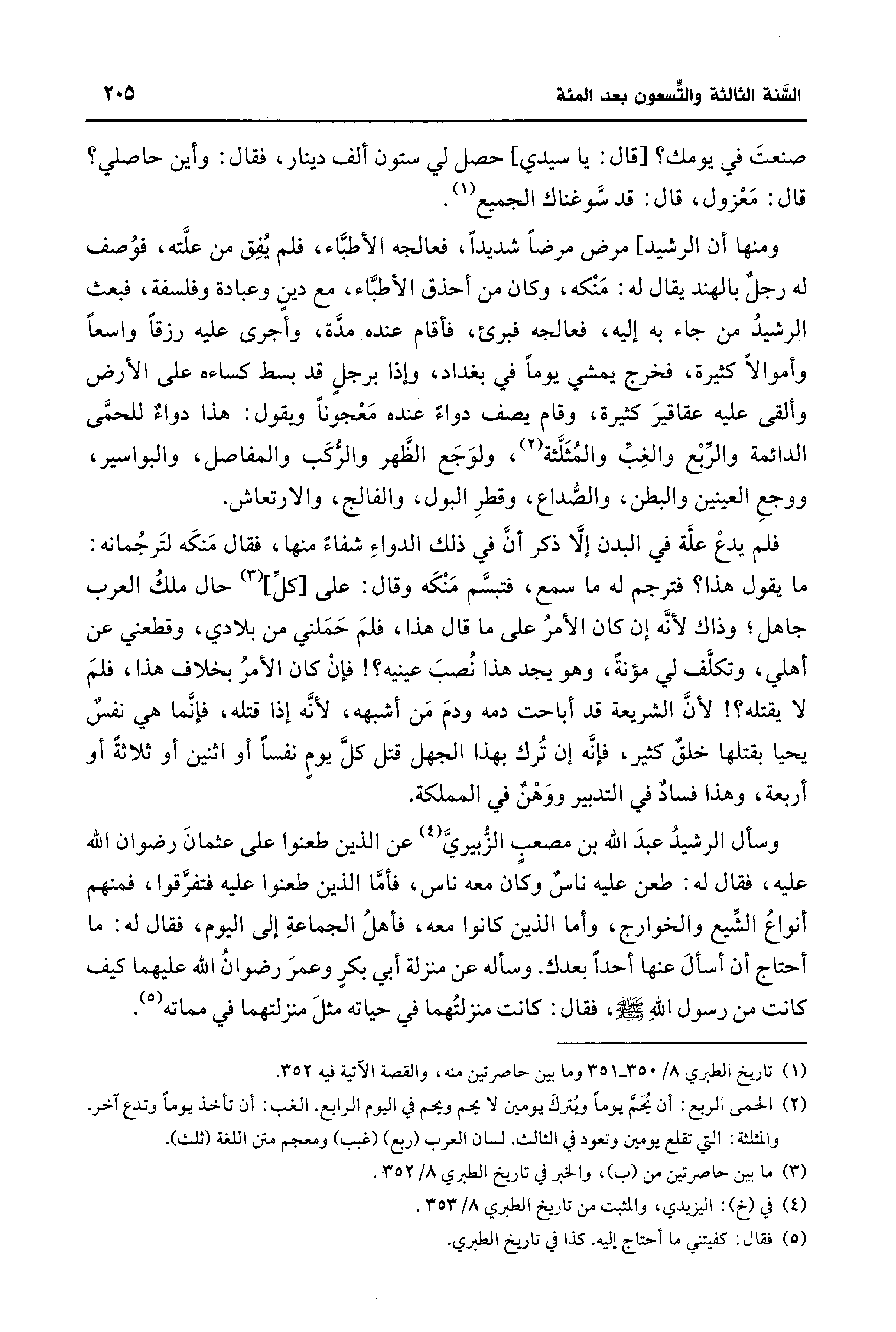 وسأل الرشيدُ عبدَ الله بن مصعبٍ الزُّبيريَّ (¬4) عن الذين طعنوا على عثمانَ رضوان الله عليه، فقال له: طعن عليه ناسٌ وكان معه ناس، فأمَّا الذين طعنوا عليه فتفرَّقوا، فمنهم أنواعُ الشِّيع والخوارج، وأما الذين كانوا معه، فأهلُ الجماعةِ إلى اليوم، فقال له: ما أحتاج أن أسألَ عنها أحدًا بعدك. وسأله عن منزلة أبي بكرٍ وعمرَ رضوانُ الله عليهما كيف كانت من رسول اللهِ - صلى الله عليه وسلم -، فقال: كانت منزلتُهما في حياته مثلَ منزلتهما في مماته (¬5).