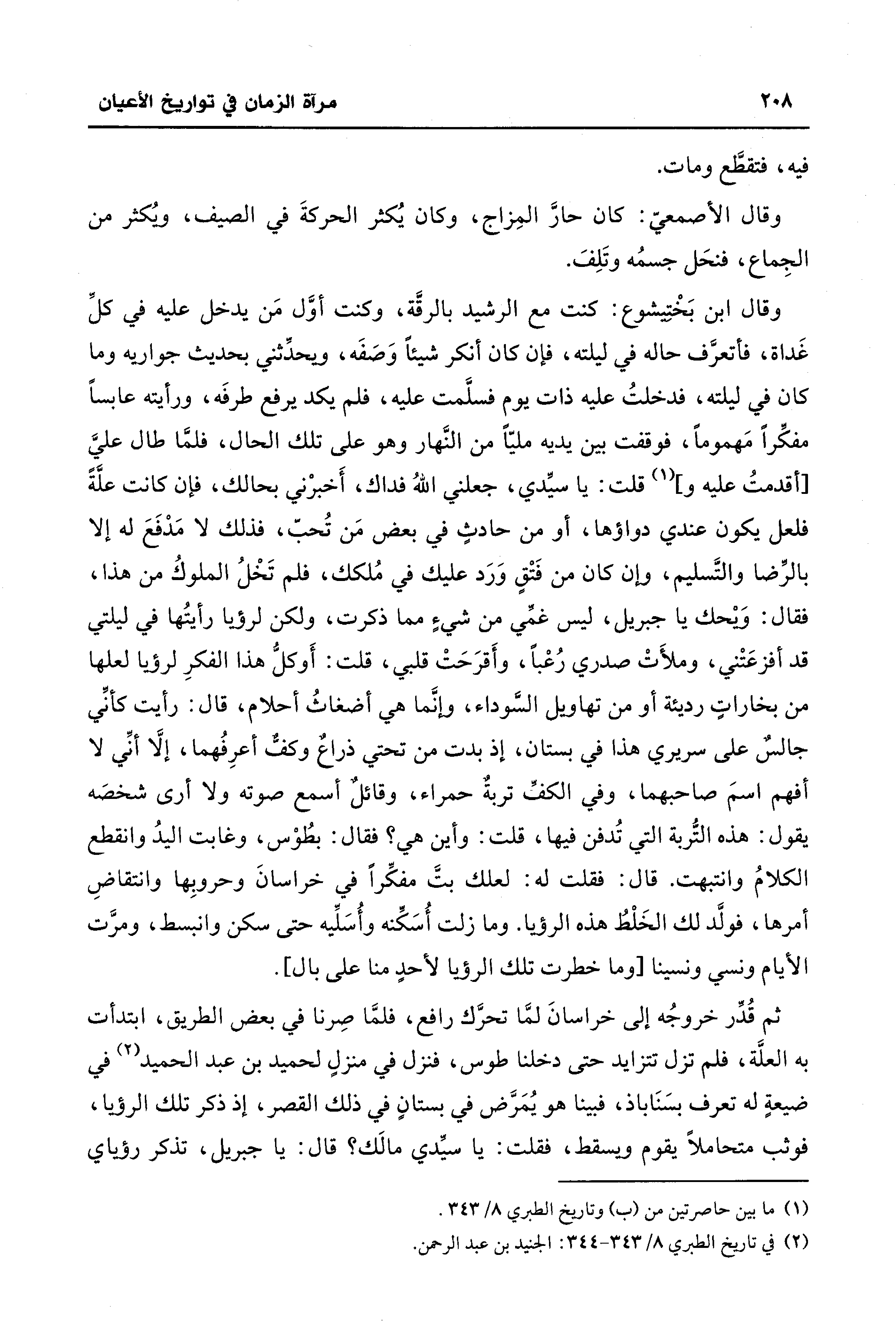 ثم قُدِّر خروجُه إلى خراسانَ لمَّا تحرَّك رافع، فلمَّا صِرنا في بعض الطريق، ابتدأت به العلَّة، فلم تزل تتزايد حتَّى دخلنا طوس، فنزل في منزلٍ لحميد بن عبد الحميد (¬2) في ضيعةٍ له تعرف بسَنَاباذ، فبينا هو يُمَرَّض في بستانٍ في ذلك القصر، إذ ذكر تلك الرؤيا، فوثب متحاملًا يقوم ويسقط، فقلت: يا سيِّدي مالك؟ قال: يا جبريل، تذكر رؤياي