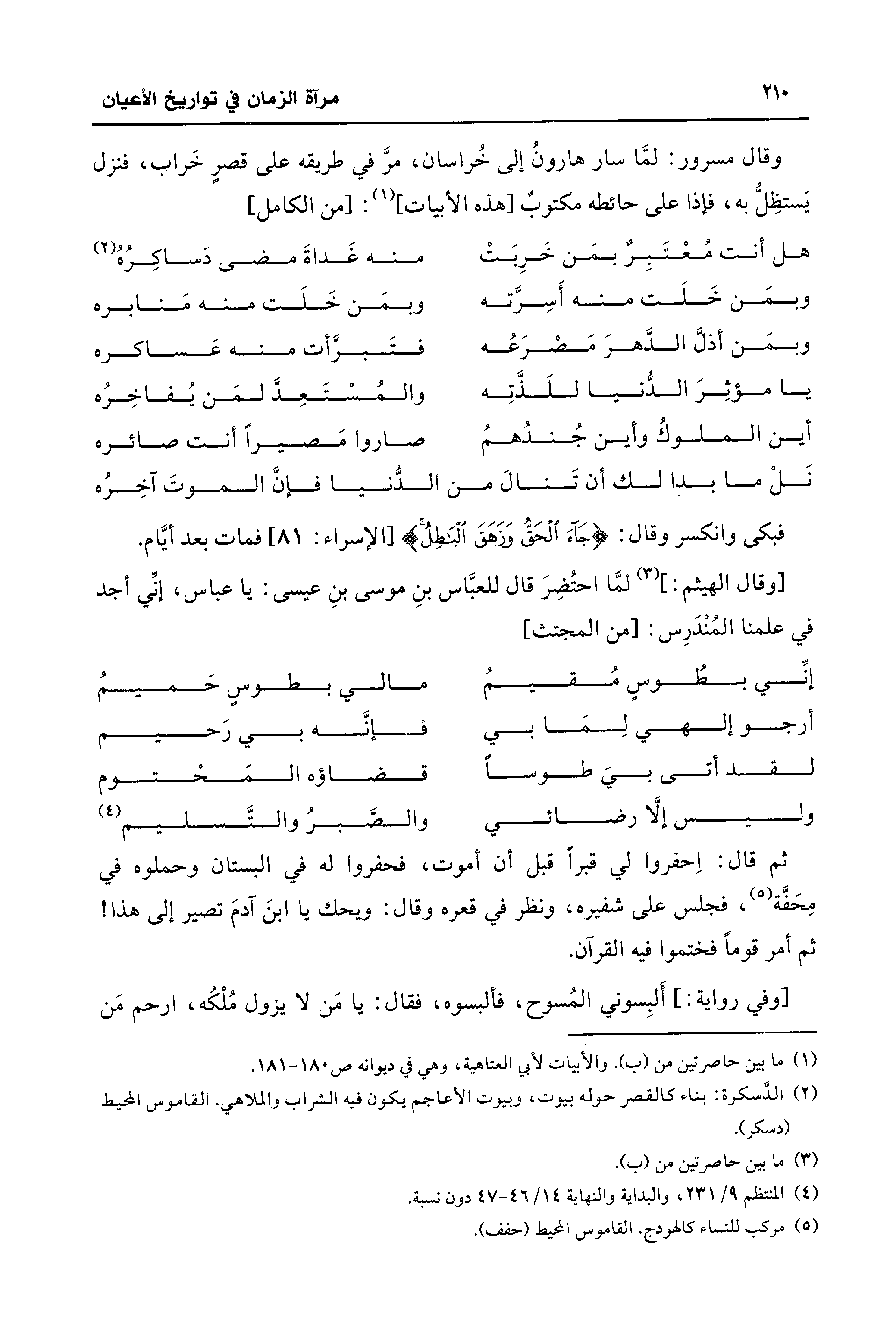 وقال مسرور: لمَّا سار هارونُ إلى خُراسان، مرَّ في طريقه على قصرٍ خَراب، فنزل يَستظِلُّ به، فإذا على حائطه مكتوبٌ [هذه الأبيات] (¬1): [من الكامل]