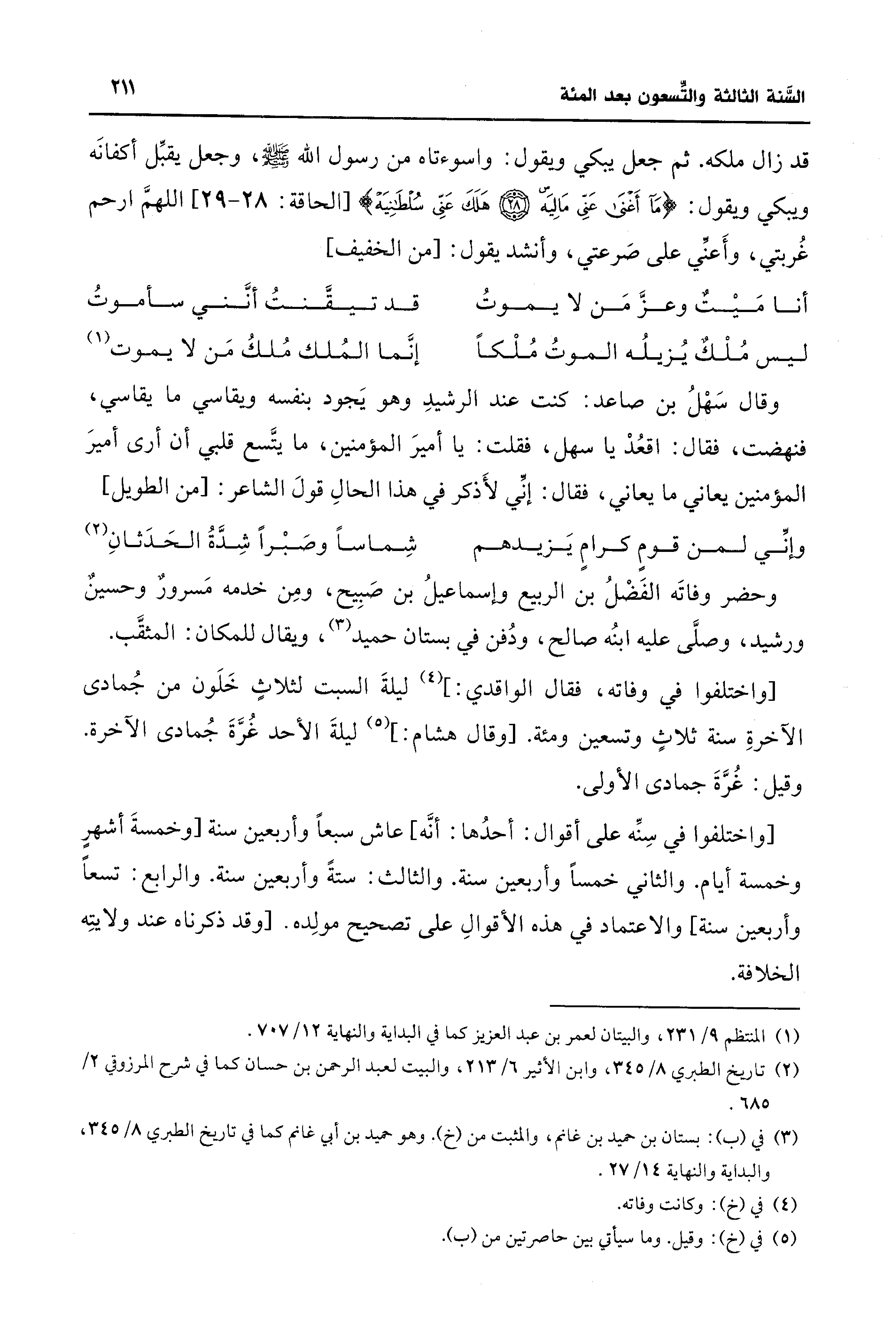 قد زال ملكه. ثم جعل يبكي ويقول. واسوءتاه من رسول الله - صلى الله عليه وسلم -، وجعل يقبِّل أكفانَه ويبكي ويقول: {مَا أَغْنَى عَنِّي مَالِيَهْ (28) هَلَكَ عَنِّي سُلْطَانِيَهْ} [الحاقة: 28 - 29] اللهمَّ ارحم غُربتي، وأَعنِّي على صَرعتي، وأنشد يقول: [من الخفيف]