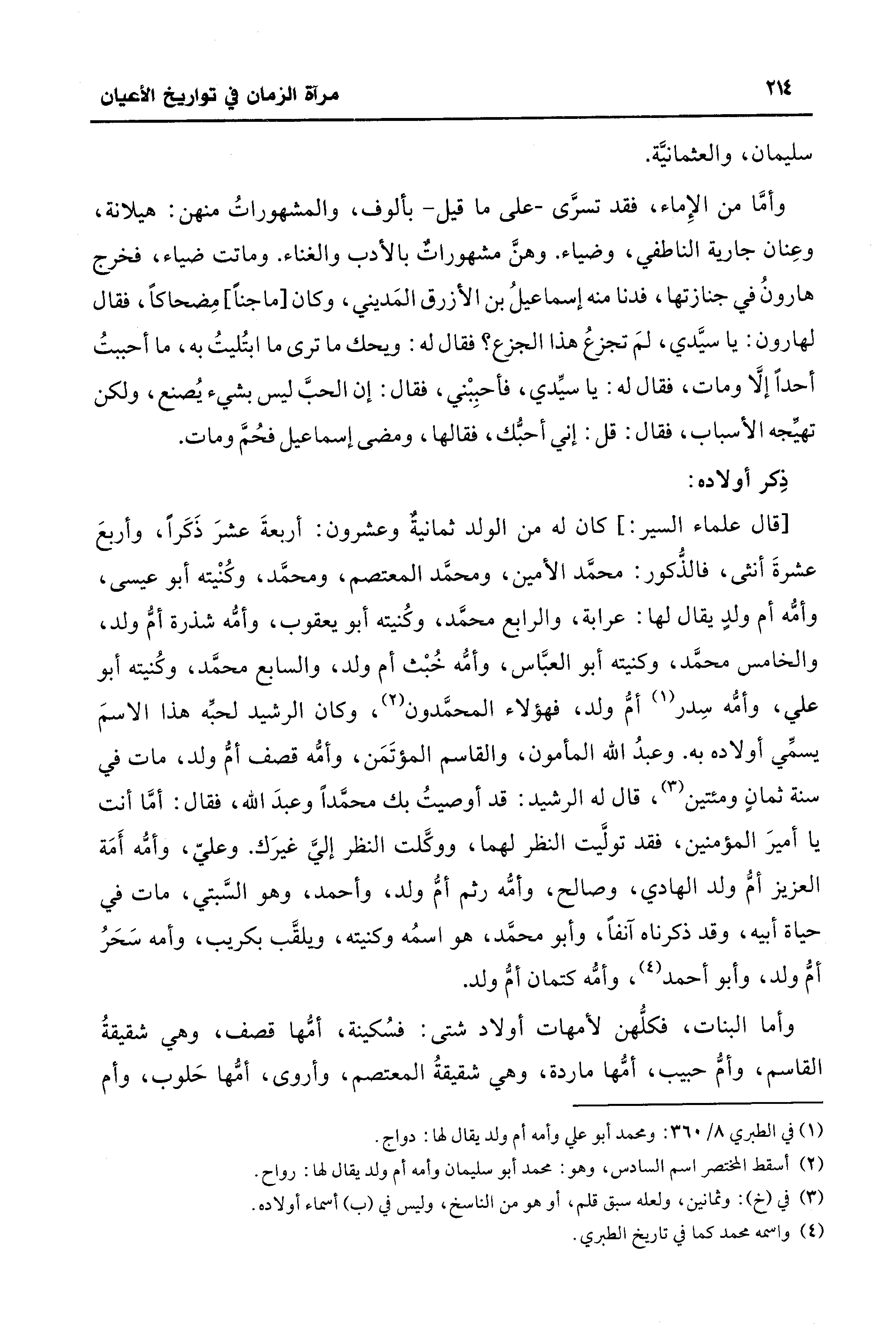 [قال علماء السير: ] كان له من الولد ثمانية وعشرون: أربعةَ عشرَ ذَكَرًا، وأربعَ عشرةَ أنثى، فالذُّكور: محمَّد الأمين، ومحمَّد المعتصم، ومحمَّد، وكُنْيته أبو عيسى، وأمُّه أم ولدٍ يقال لها: عرابة، والرابع محمَّد، وكُنيته أبو يعقوب، وأمُّه شذرة أمُّ ولد، والخامس محمَّد، وكنيته أبو العبَّاس، وأمُّه خُبْث أم ولد، والسابع محمَّد، وكُنيته أبو علي، وأمُّه سِدر (¬1) أمُّ ولد، فهؤلاء المحمَّدون (¬2)، وكان الرشيد لحبِّه هذا الاسمَ يسمِّي أولاده به. وعبدُ الله المأمون، والقاسم المؤتَمَن، وأمُّه قصف أمُّ ولد، مات في سنة ثمانٍ ومئتين (¬3)، قال له الرشيد: قد أوصيتُ بك محمَّدًا وعبدَ الله، فقال: أمَّا أنت يا أميرَ المؤمنين، فقد تولَّيت النظر لهما، ووكَّلت النظر إليَّ غيرَك. وعليّ، وأمُّه أَمَة العزيز أمُّ ولد الهادي، وصالح، وأمُّه رثم أمُّ ولد، وأحمد، وهو السَّبتي، مات في حياة أبيه، وقد ذكرناه آنفًا، وأبو محمَّد، هو اسمُه وكنيته، ويلقَّب بكريب، وأمه سَحَرُ أمُّ ولد، وأبو أحمد (¬4)، وأمُّه كتمان أمُّ ولد.