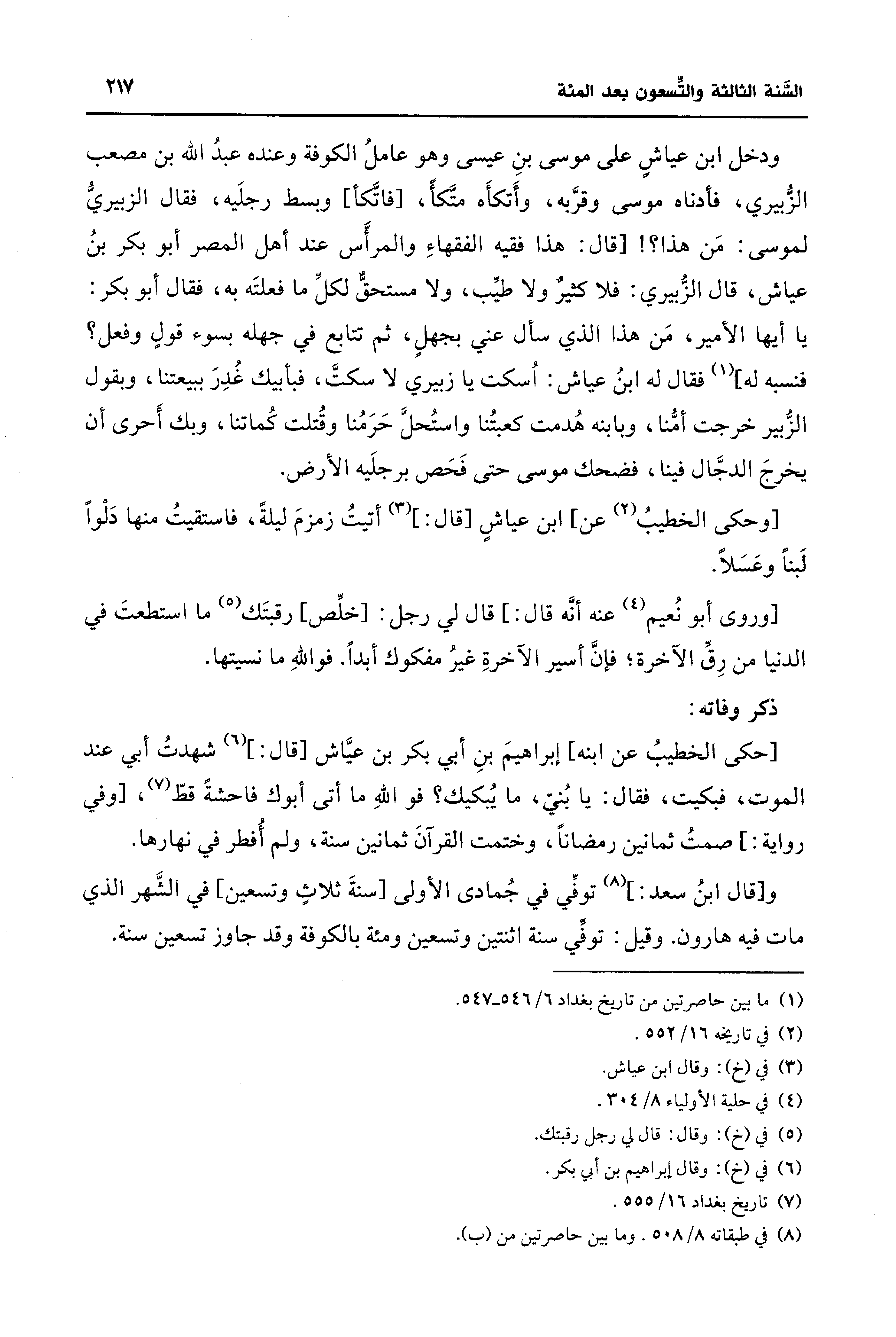 ودخل ابن عياشٍ على موسى بنِ عيسى وهو عاملُ الكوفة وعنده عبدُ الله بن مصعب الزبيري، فأدناه موسى وقرَّبه، وأَتكأَه متَّكأ، [فاتَّكأ] وبسط رجلَيه، فقال الزبيريُّ لموسى: مَن هذا؟ ! [قال: هذا فقيه الفقهاءِ والمرأَس عند أهل المصر أبو بكر بنُ عياش، قال الزبيري: فلا كثيرٌ ولا طيِّب، ولا مستحقٌّ لكلِّ ما فعلتَه به، فقال أبو بكر: يا أيها الأمير، مَن هذا الَّذي سأل عني بجهل، ثم تتابع في جهله بسوء قولٍ وفعل؟ فنسبه له] (¬1) فقال له ابنُ عياش: اُسكت يا زبيري لا سكتَّ، فبأبيك غُدِرَ ببيعتنا، وبقول الزُّبير خرجت أمُّنا، وبابنه هُدمت كعبتُنا واستُحلَّ حَرَمُنا وقُتلت كُماتنا، وبك أَحرى أن يخرجَ الدجَّال فينا، فضحك موسى حتَّى فَحَص برجلَيه الأرض.