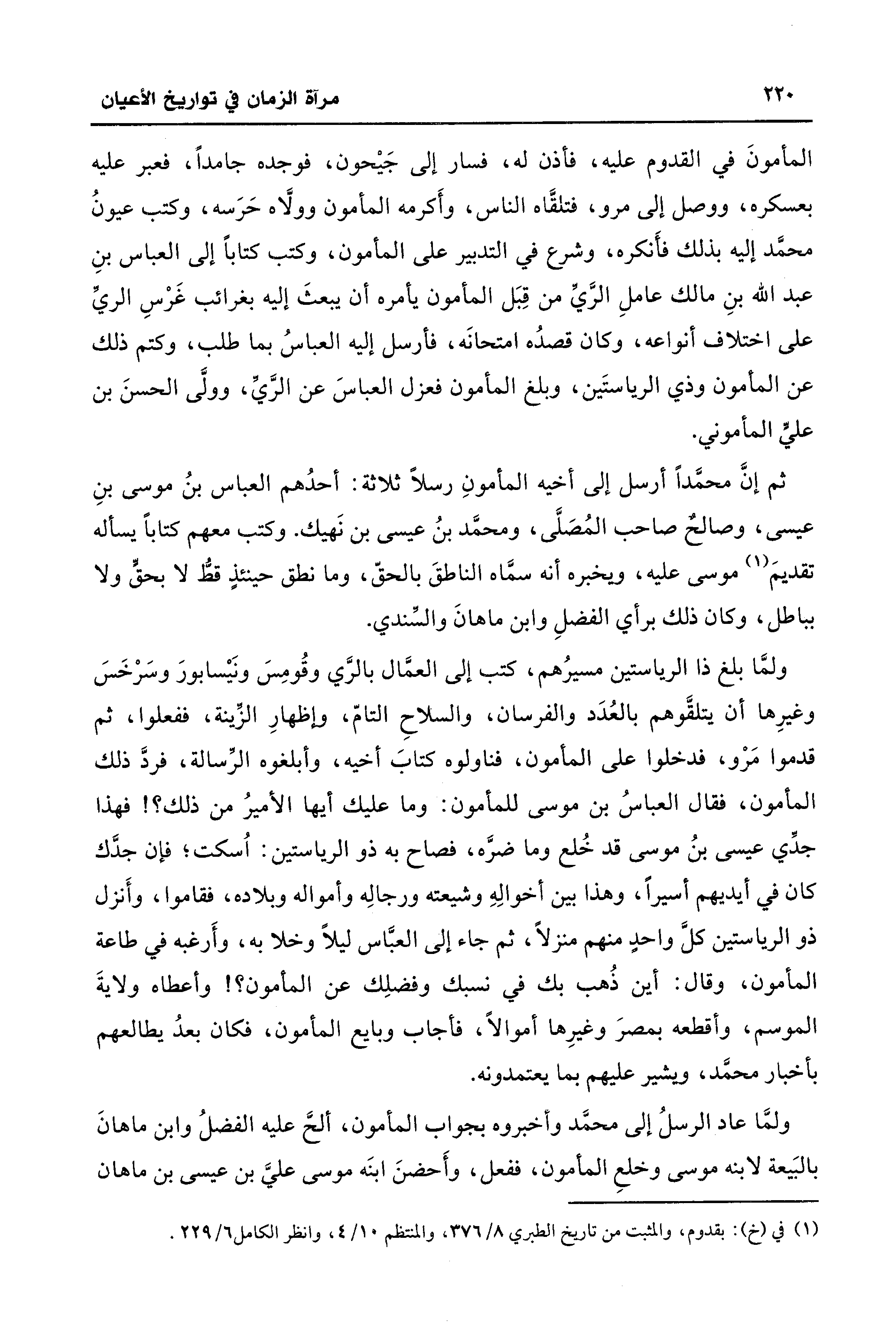 ولمَّا بلغ ذا الرياستين مسيرُهم، كتب إلى العمَّال بالرَّي وقُومِسَ ونَيسابورَ وسَرْخَسَ وغيرِها أن يتلقَّوهم بالعُدَد والفرسان، والسلاحِ التامّ، وإظهارِ الزِّينة، ففعلوا، ثم قدموا مَرْو، فدخلوا على المأمون، فناولوه كتابَ أخيه، وأبلغوه الرِّسالة، فردَّ ذلك المأمون، فقال العباسُ بن موسى للمأمون: وما عليك أيها الأميرُ من ذلك؟ ! فهذا جدِّي عيسى بنُ موسى قد خُلع وما ضرَّه، فصاح به ذو الرياستين: اُسكت؛ فإن جدَّك كان في أيديهم أسيرًا، وهذا بين أخوالِهِ وشيعته ورجالِه وأمواله وبلاده، فقاموا، وأَنزل ذو الرياستين كلَّ واحدٍ منهم منزلًا، ثم جاء إلى العبَّاس ليلًا وخلا به، وأَرغبه في طاعة المأمون، وقال: أين ذُهب بك في نسبك وفضلِك عن المأمون؟ ! وأعطاه ولايةَ الموسم، وأقطعه بمصرَ وغيرِها أموالًا، فاجاب وبايع المأمون، فكان بعدُ يطالعهم بأخبار محمَّد، ويشير عليهم بما يعتمدونه.