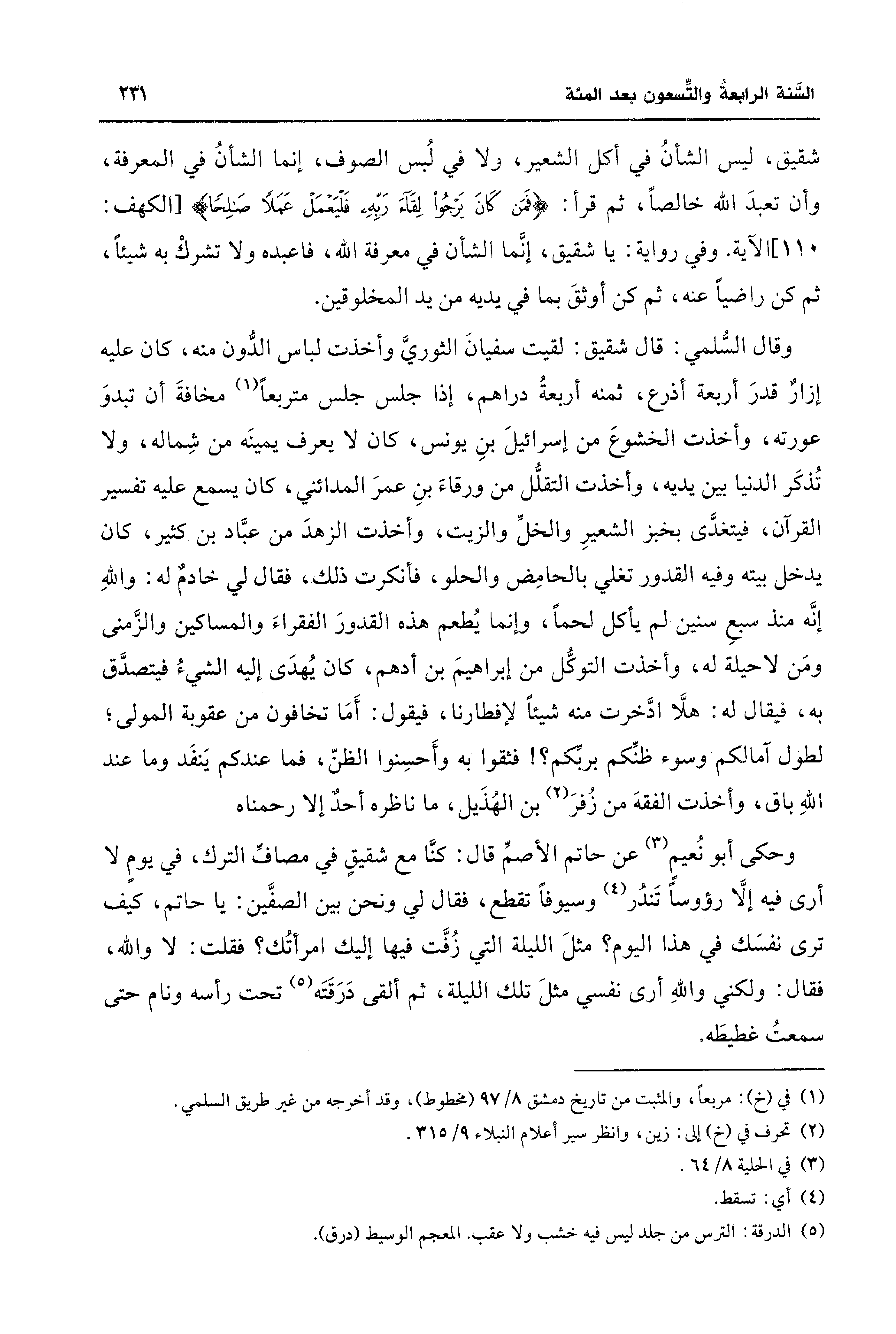 شقيق، ليس الشأنُ في أكل الشعير، ولا في لُبس الصوف، إنما الشأنُ في المعرفة، وأن تعبدَ الله خالصًا، ثم قرأ: {فَمَنْ كَانَ يَرْجُو لِقَاءَ رَبِّهِ فَلْيَعْمَلْ عَمَلًا صَالِحًا} [الكهف: 110] الآية. وفي رواية: يا شقيق، إنَّما الشأن في معرفة الله، فاعبده ولا تشركْ به شيئًا، ثم كن راضيًا عنه، ثم كن أوثقَ بما في يديه من يد المخلوقين.