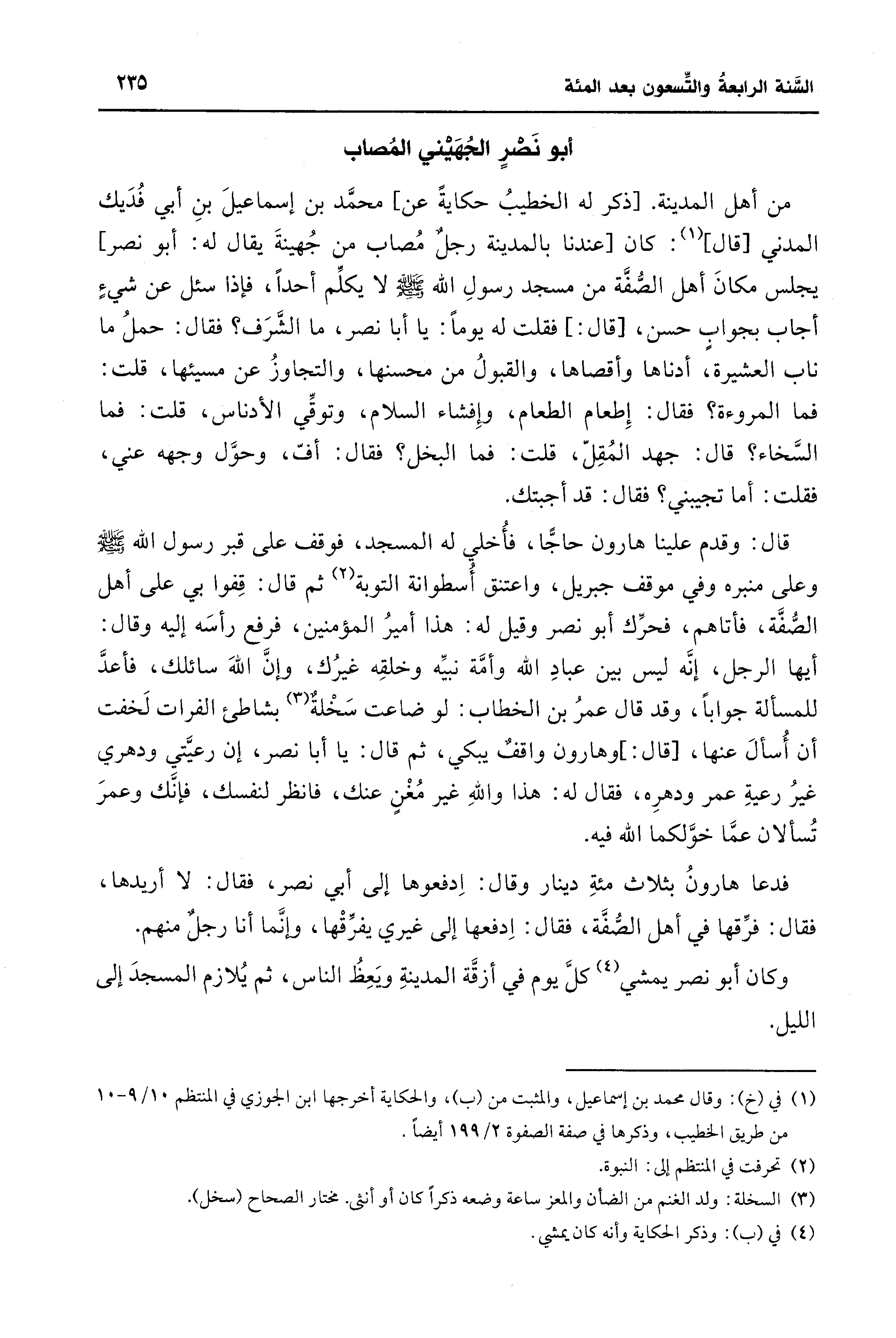 من أهل المدينة. [ذكر له الخطيبُ حكايةً عن] محمَّد بن إسماعيلَ بنِ أبي فُدَيك المدني [قال] (¬1): كان [عندنا بالمدينة رجلٌ مُصاب من جُهينةَ يقال له: أبو نصر] يجلس مكانَ أهل الصُّفَّة من مسجد رسولِ الله - صلى الله عليه وسلم - لا يكلِّم أحدًا، فإذا سئل عن شيءٍ أجاب بجوابٍ حسن، [قال: ] فقلت له يومًا: يا أبا نصر، ما الشَّرَف؟ فقال: حملُ ما ناب العشيرة، أدناها وأقصاها، والقبولُ من محسنها، والتجاوزُ عن مسيئها، قلت: فما المروءة؟ فقال: إِطعام الطعام، وإِفشاء السلام، وتوقِّي الأدناس، قلت: فما السَّخاء؟ قال: جهد المُقِلّ، قلت: فما البخل؟ فقال: أفّ، وحوَّل وجهه عني، فقلت: أما تجيبني؟ فقال: قد أجبتك.