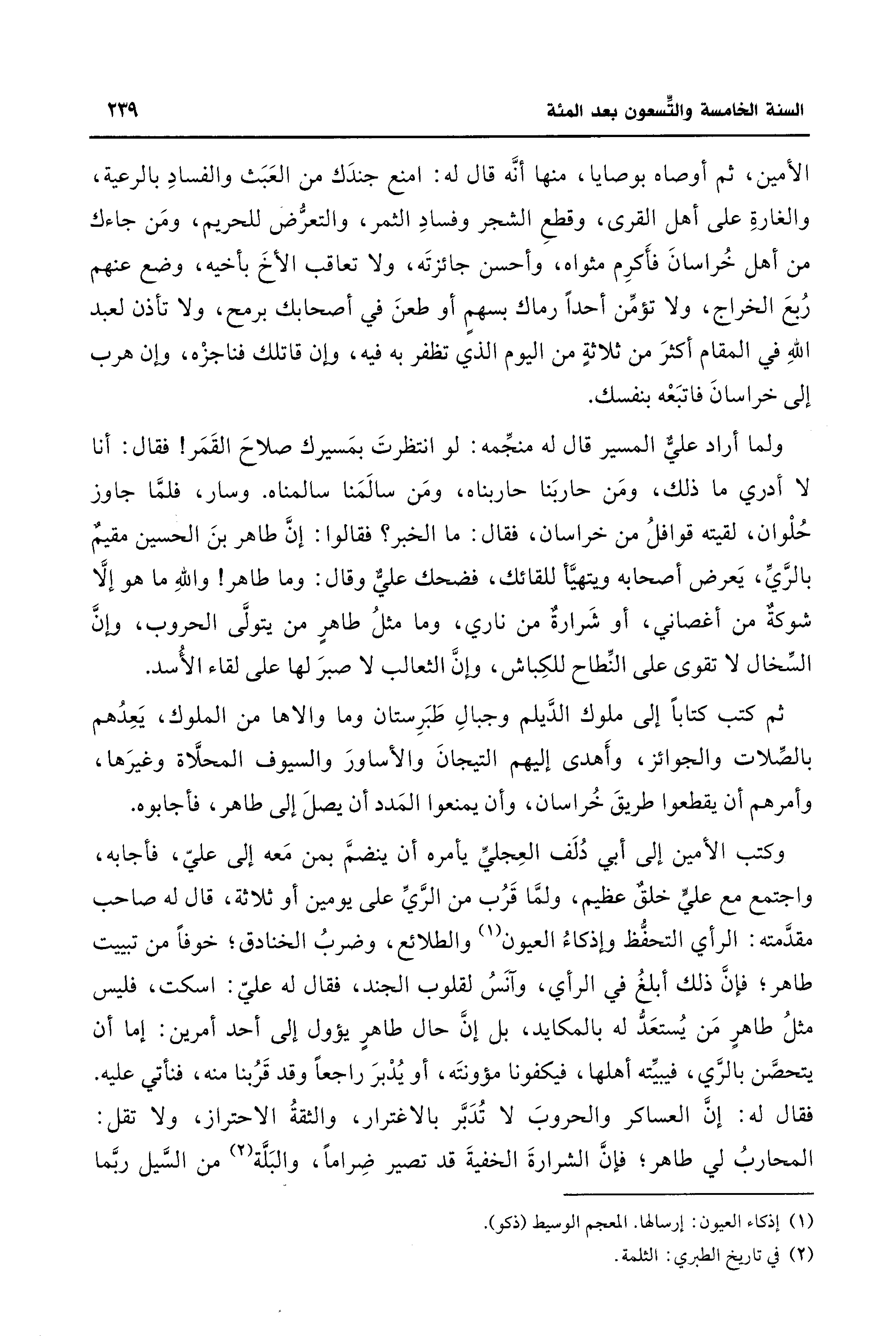 ثم كتب كتابًا إلى ملوك الدَّيلم وجبالِ طَبَرِستان وما والاها من الملوك، يَعِدُهم بالصِّلات والجوائز، وأَهدى إليهم التيجانَ والأساورَ والسيوف المحلَّاة وغيرَها، وأمرهم أن يقطعوا طريقَ خُراسان، وأن يمنعوا المَدد أن يصلَ إلى طاهر، فأجابوه.