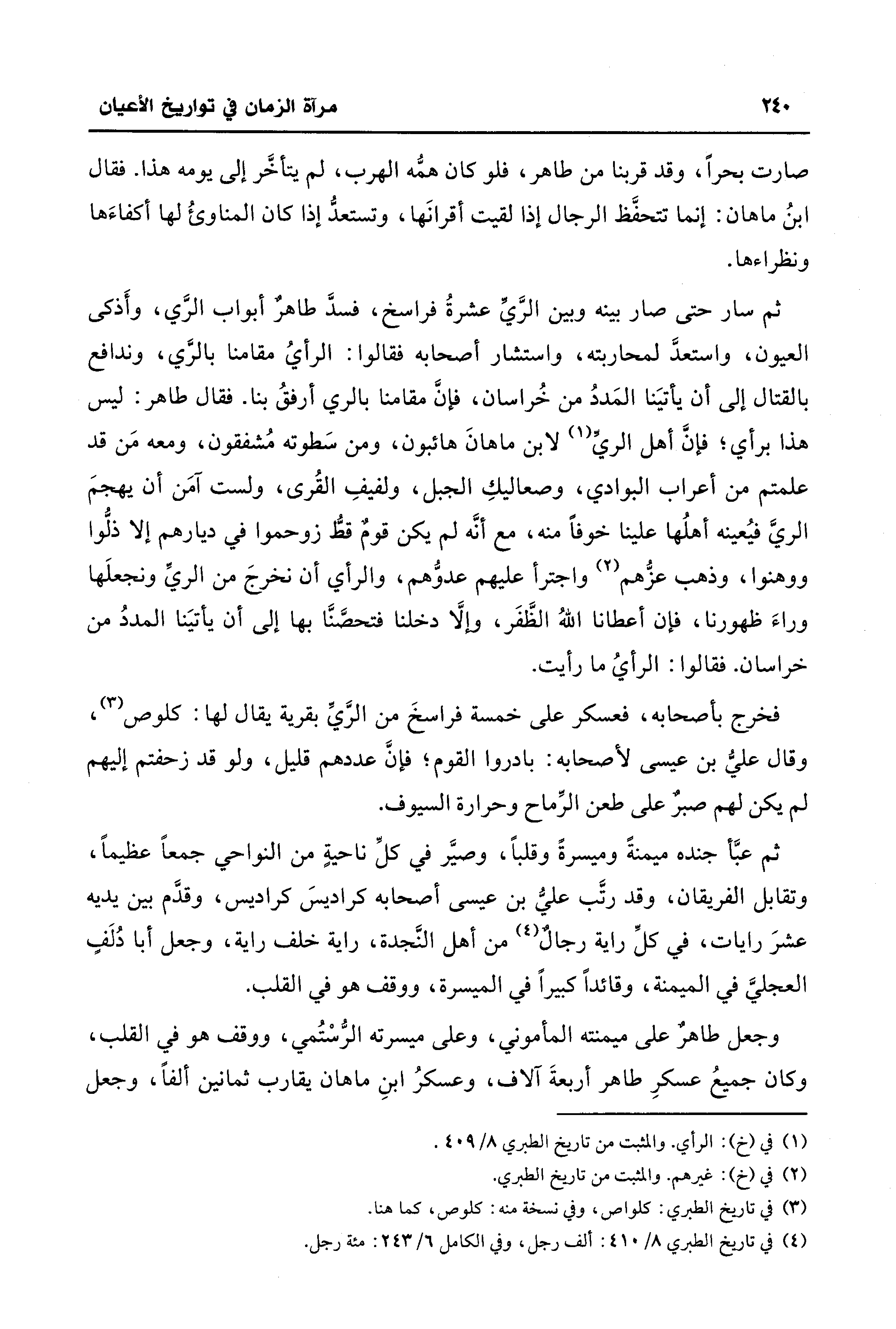 وجعل طاهرٌ على ميمنته المأموني، وعلى ميسرته الرُّسْتُمي، ووقف هو في القلب، وكان جميعُ عسكرِ طاهر أربعةَ آلاف، وعسكرُ ابنِ ماهان يقارب ثمانين ألفًا، وجعل