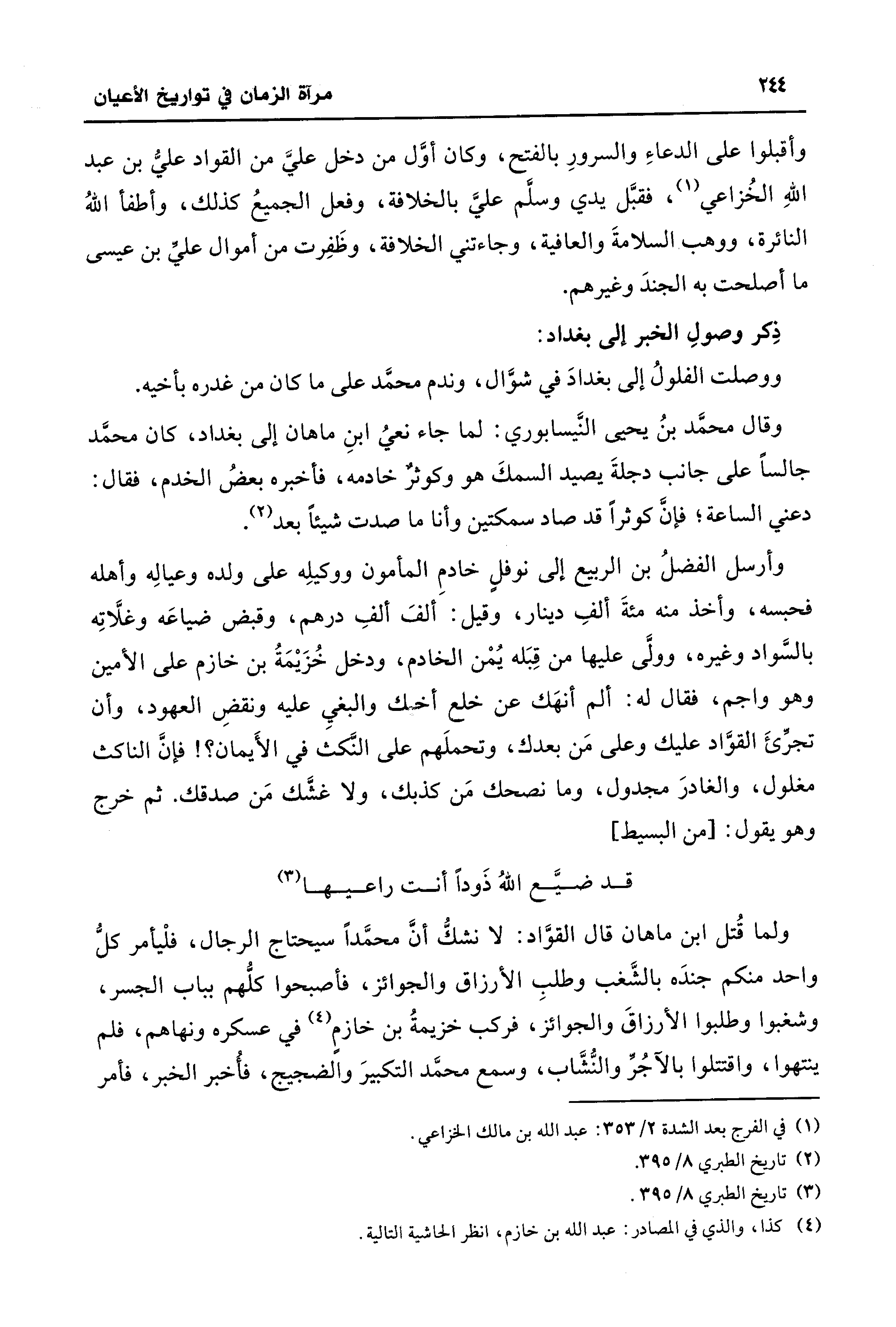 وأقبلوا على الدعاءِ والسرورِ بالفتح، وكان أوَّل من دخل عليَّ من القواد عليُّ بن عبد اللهِ الخُزاعي (¬1)، فقبَّل يدي وسلَّم عليَّ بالخلافة، وفعل الجميعُ كذلك، وأطفأ اللهُ النائرة، ووهب السلامةَ والعافية، وجاءتني الخلافة، وظَفِرت من أموال عليِّ بن عيسى ما أصلحت به الجندَ وغيرهم.