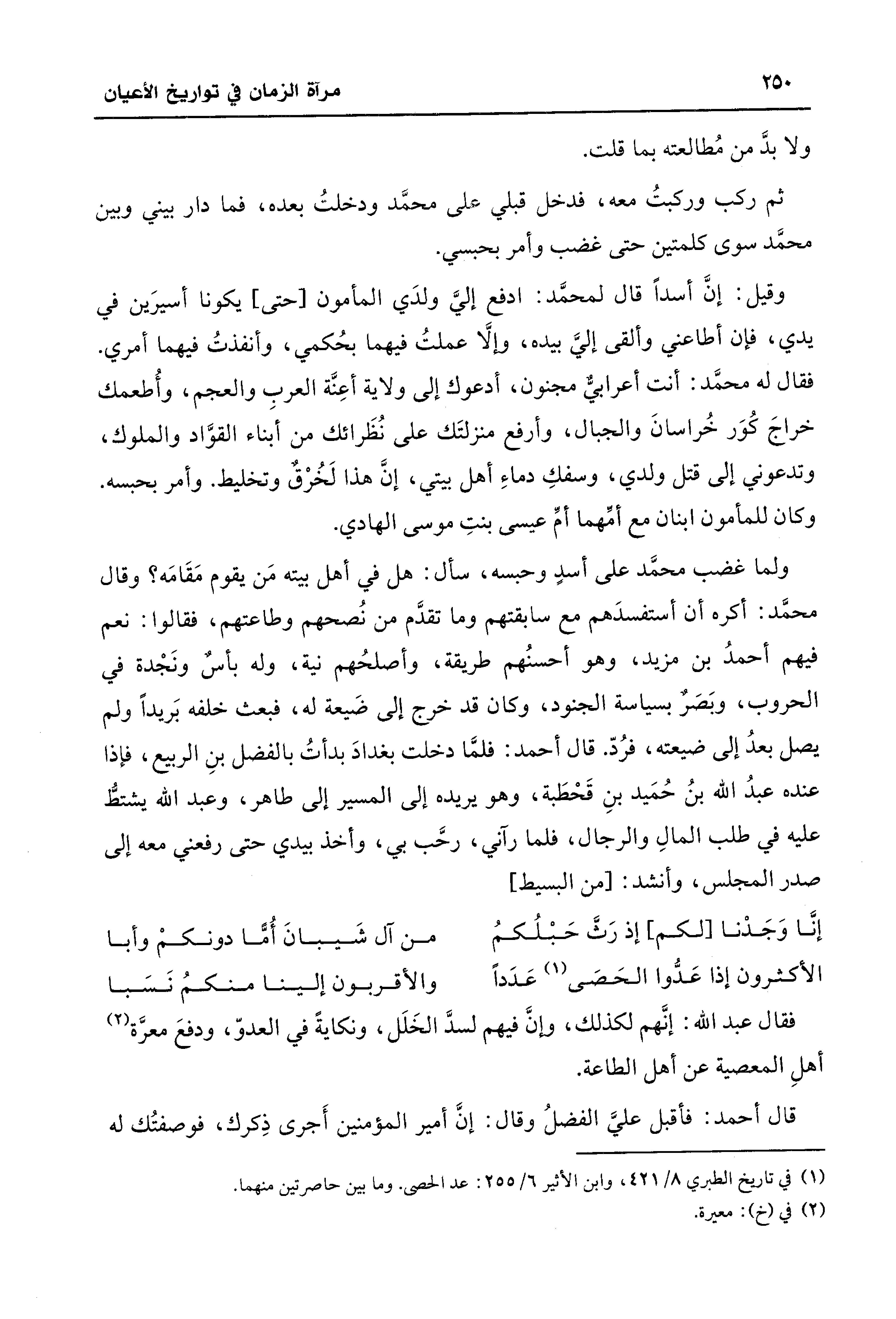 ولما غضب محمَّد على أسدٍ وحبسه، سأل: هل في أهل بيته مَن يقوم مَقَامَه؟ وقال محمَّد: أكره أن أستفسدَهم مع سابقتهم وما تقدَّم من نُصحهم وطاعتهم، فقالوا: نعم فيهم أحمدُ بن مزيد، وهو أحسنُهم طريقة، وأصلحُهم نية، وله بأسٌ ونَجْدة في الحروب، وبَصَرٌ بسياسة الجنود، وكان قد خرج إلى ضَيعة له، فبعث خلفه بَريدًا ولم يصل بعدُ إلى ضيعته، فرُدّ. قال أحمد: فلمَّا دخلت بغدادَ بدأتُ بالفضل بنِ الربيع، فإذا عنده عبدُ الله بنُ حُمَيد بنِ قَحْطَبة، وهو يريده إلى المسير إلى طاهر، وعبد الله يشتطُّ عليه في طلب المالِ والرجال، فلما رآني، رحَّب بي، وأخذ بيدي حتى رفعني معه إلى صدر المجلس، وأنشد: [من البسيط]