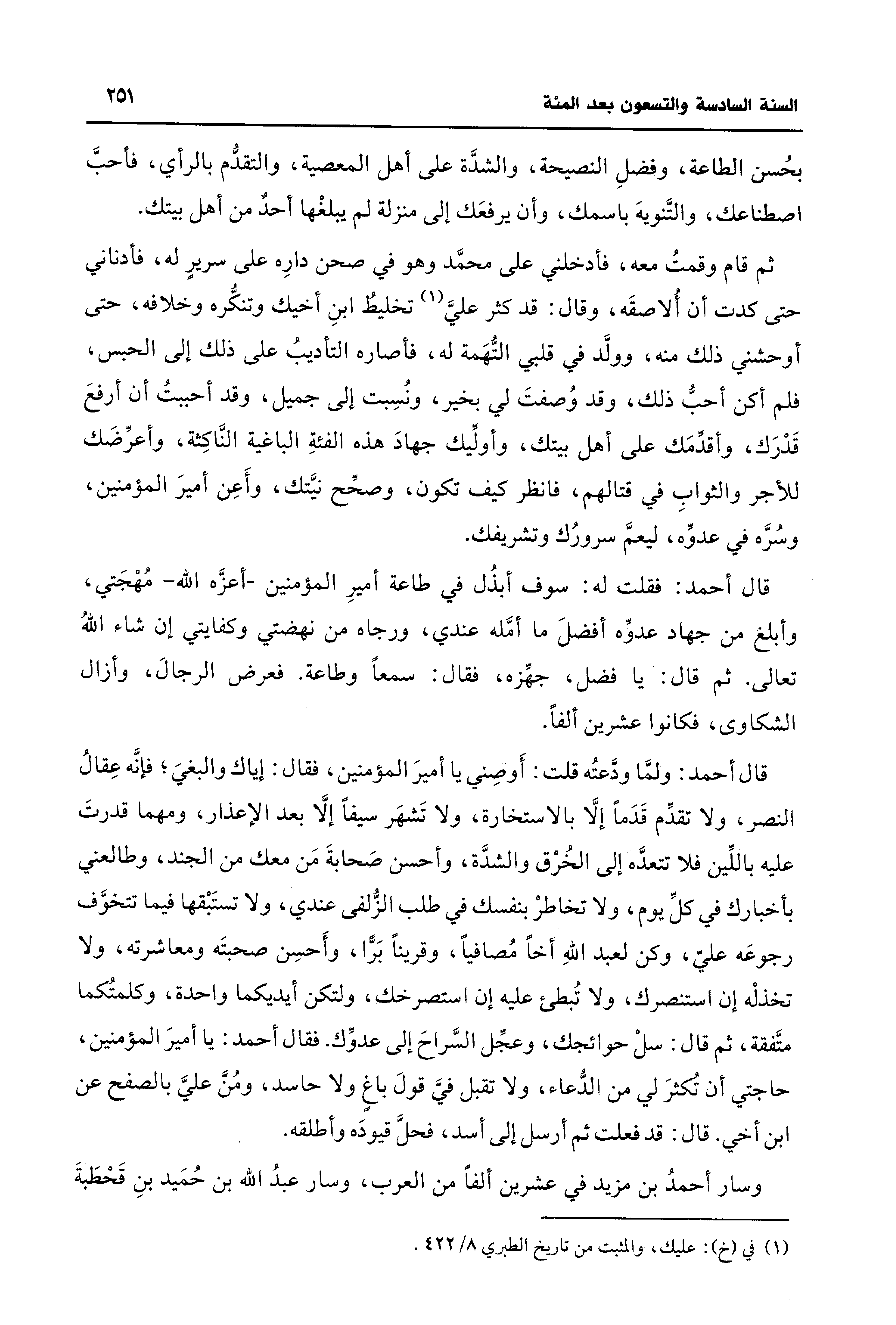 قال أحمد: فقلت له: سوف أبذُل في طاعة أميرِ المؤمنين -أعزَّه الله- مُهْجَتي، وأبلغ من جهاد عدوِّه أفضلَ ما أمَّله عندي، ورجاه من نهضتي وكفايتي إن شاء اللهُ تعالى. ثم قال: يا فضل، جهِّزه، فقال: سمعًا وطاعة. فعرض الرجال، وأزال الشكاوى، فكانوا عشرين ألفًا.