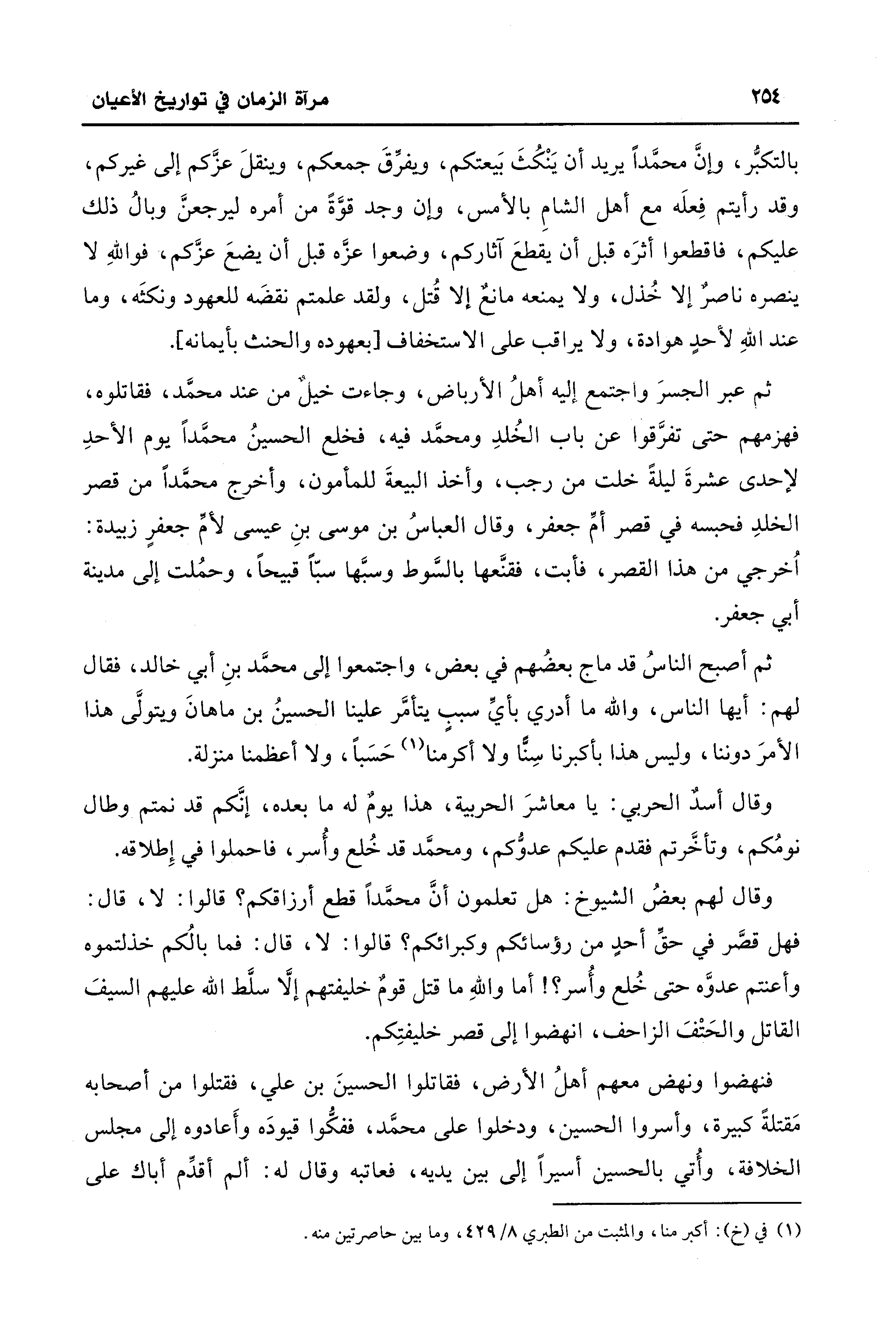 فنهضوا ونهض معهم أهلُ الأرض، فقاتلوا الحسينَ بن علي، فقتلوا من أصحابه مَقتلةً كبيرة، وأسروا الحسين، ودخلوا على محمَّد، ففكُّوا قيودَه وأَعادوه إلى مجلس الخلافة، وأُتي بالحسين أسيرًا إلى بين يديه، فعاتبه وقال له: ألم أقدِّم أباك على