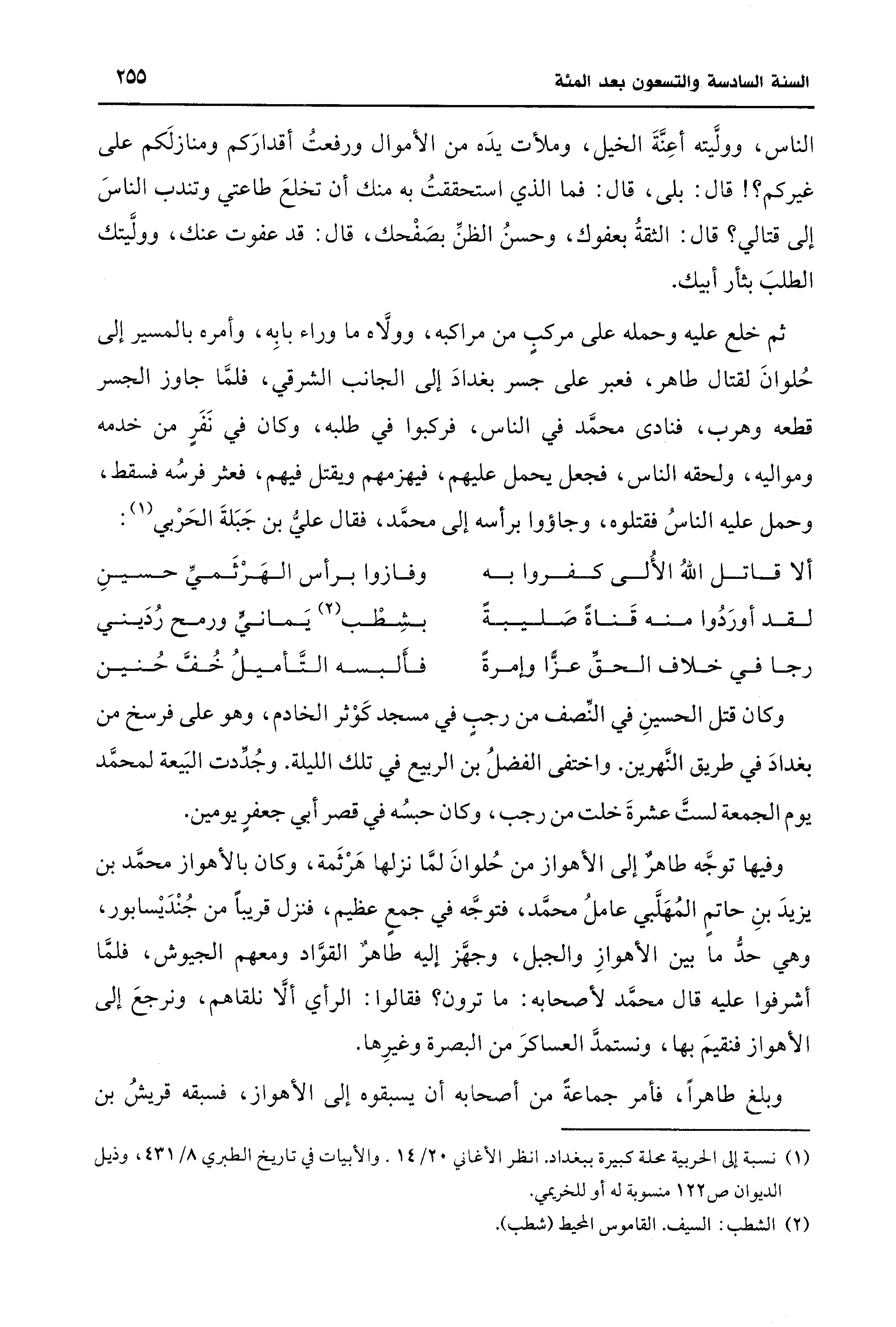 (¬1) نسبة إلى الحربية محلة كبيرة ببغداد. انظر الأغاني 20/ 14. والأبيات في تاريخ الطبري 8/ 431، وذيل الديوان ص 122 منسوبة له أو للخريمي.