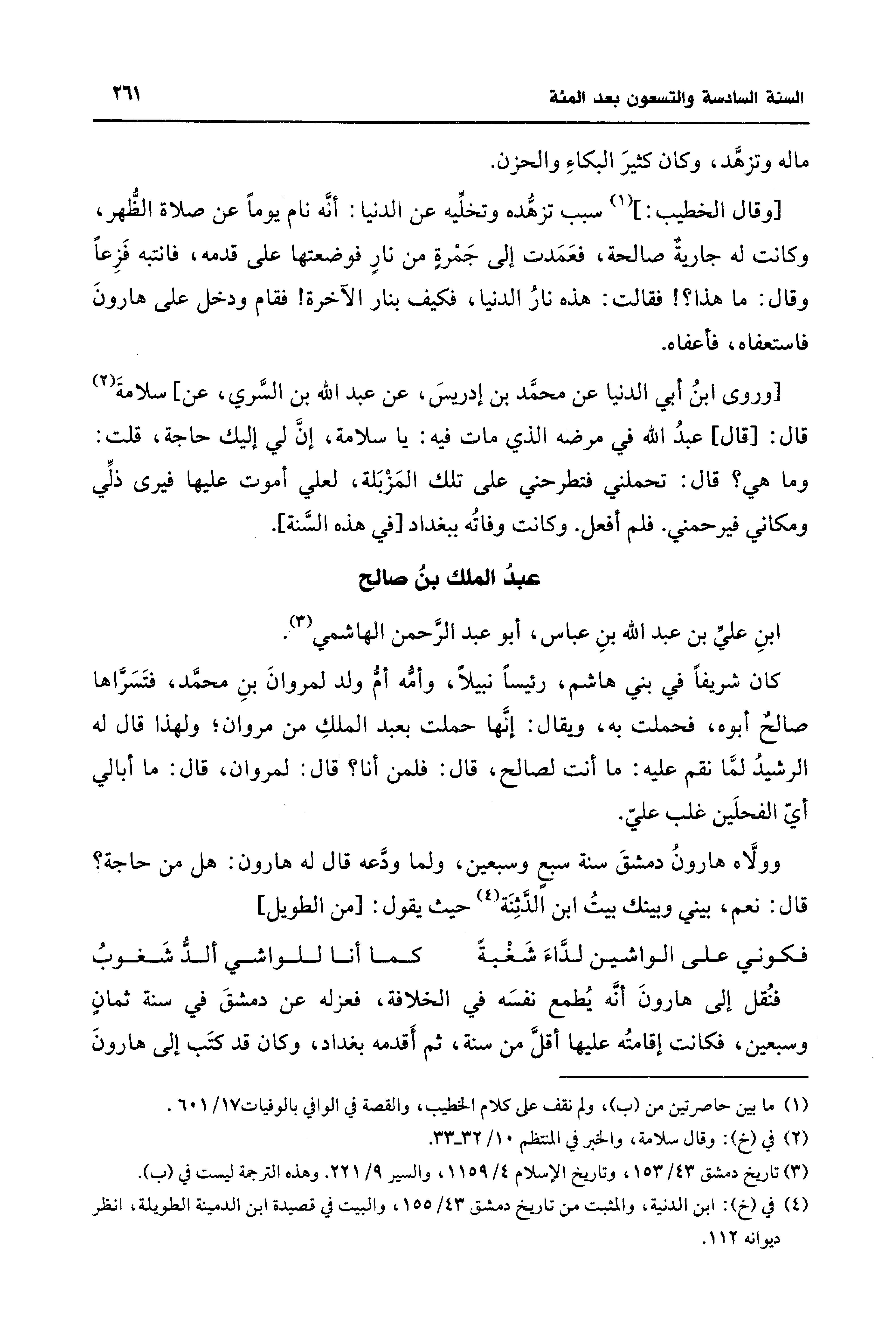 [وروى ابنُ أبي الدنيا عن محمَّد بن إدريسَ، عن عبد الله بن السَّري، عن] سلامةَ (¬2) قال: [قال] عبدُ الله في مرضه الذي مات فيه: يا سلامة، إنَّ لي إليك حاجة، قلت: وما هي؟ قال: تحملني فتطرحني على تلك المَزْبَلة، لعلي أموت عليها فيرى ذلِّي ومكاني فيرحمني. فلم أفعل. وكانت وفاتُه ببغداد [في هذه السَّنة].