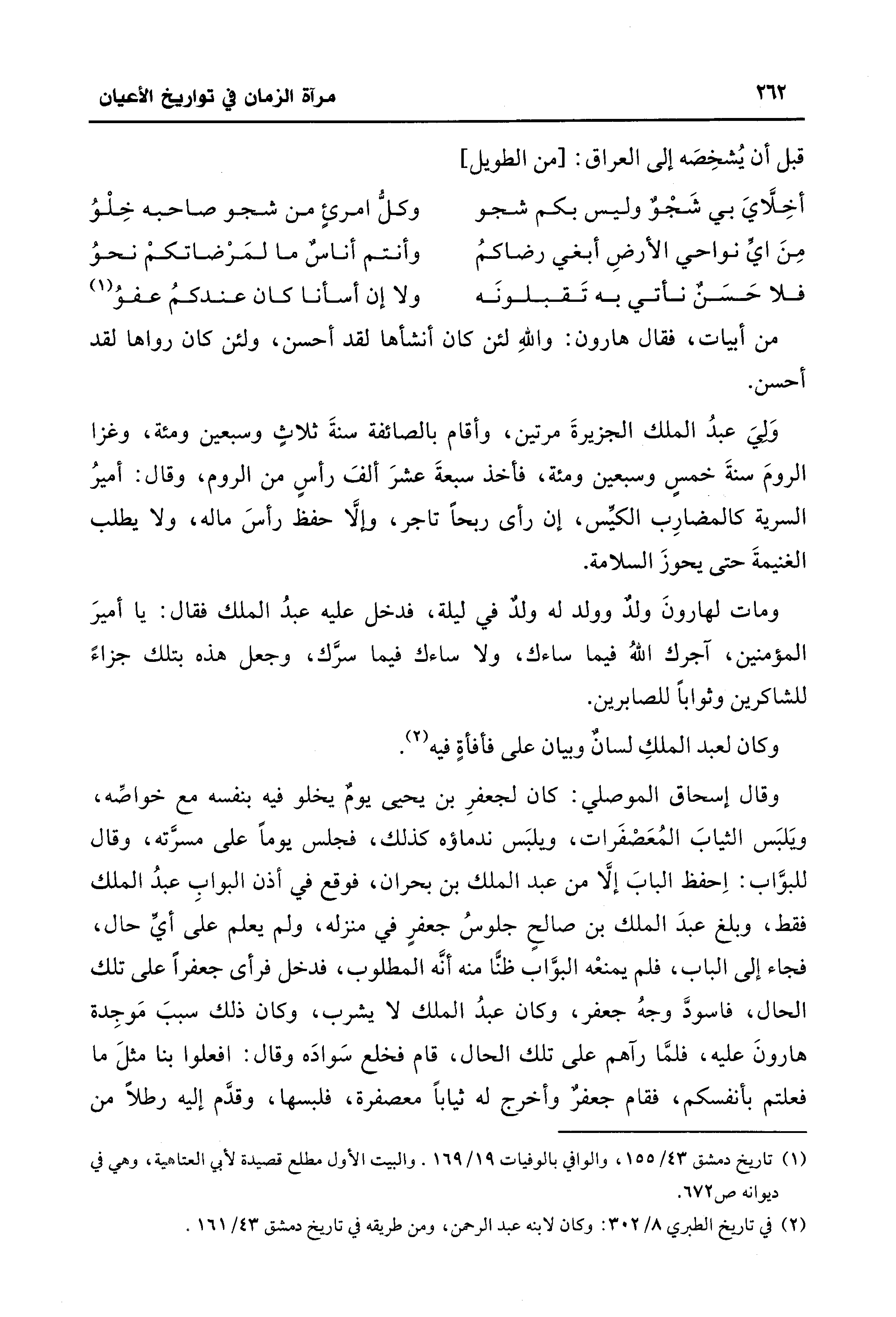 (¬1) تاريخ دمشق 43/ 155، والوافي بالوفيات 19/ 169. والبيت الأول مطلع قصيدة لأبي العتاهية، وهي في ديوانه ص 672.