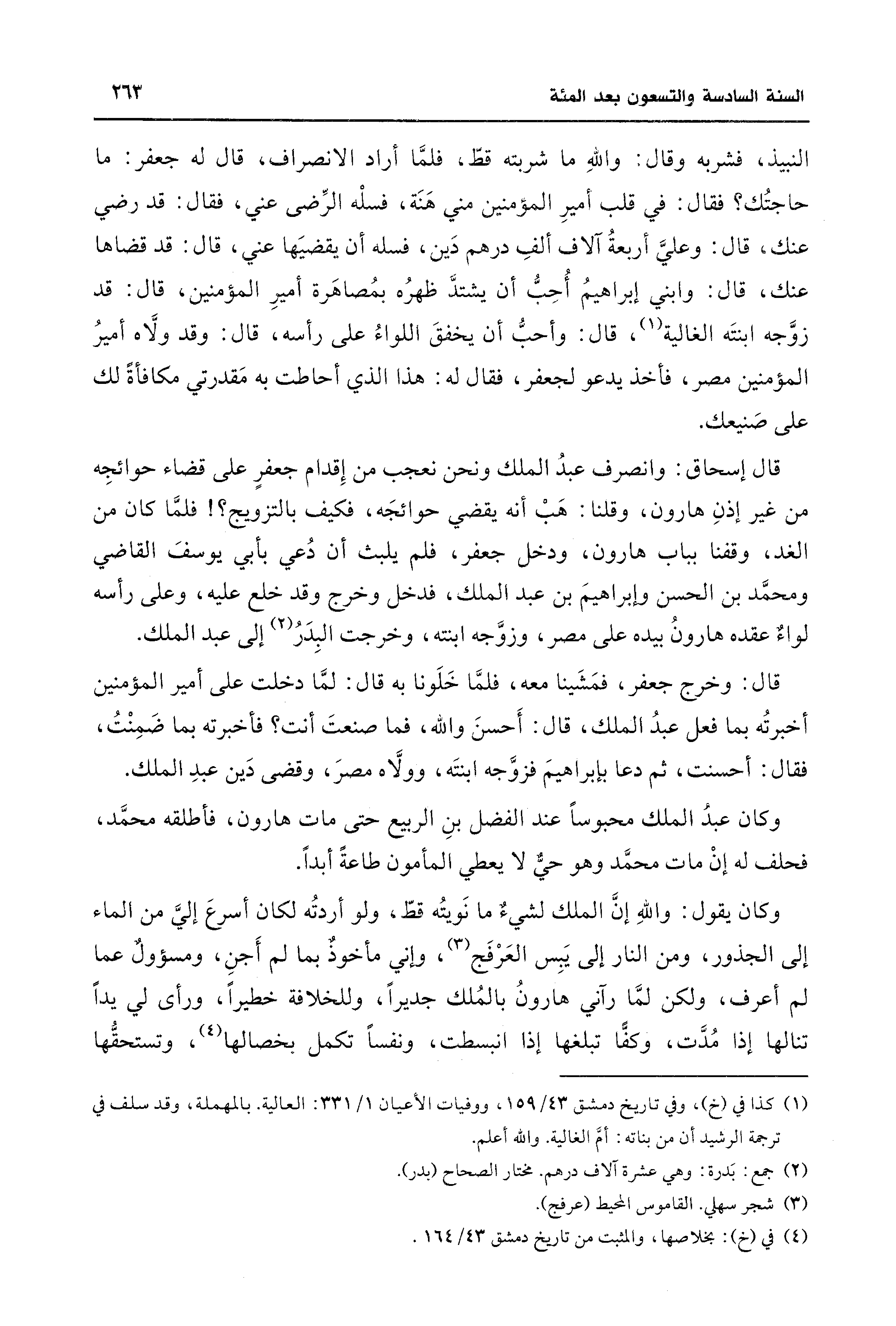 قال: وخرج جعفر، فمَشَينا معه، فلمَّا خَلَونا به قال: لمَّا دخلت على أمير المؤمنين أخبرتُه بما فعل عبدُ الملك، قال: أَحسنَ والله، فما صنعتَ أنت؟ فأخبرته بما ضَمِنْتُ، فقال: أحسنت، ثم دعا بإبراهيمَ فزوَّجه ابنتَه، وولَّاه مصرَ، وقضى دَين عبدِ الملك.